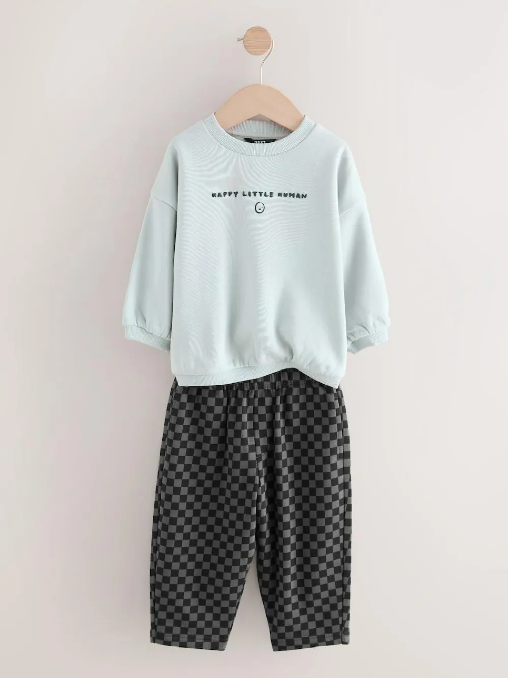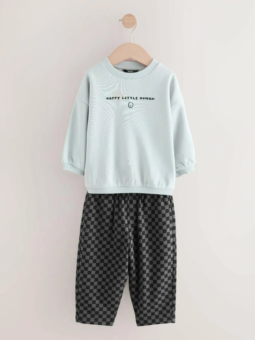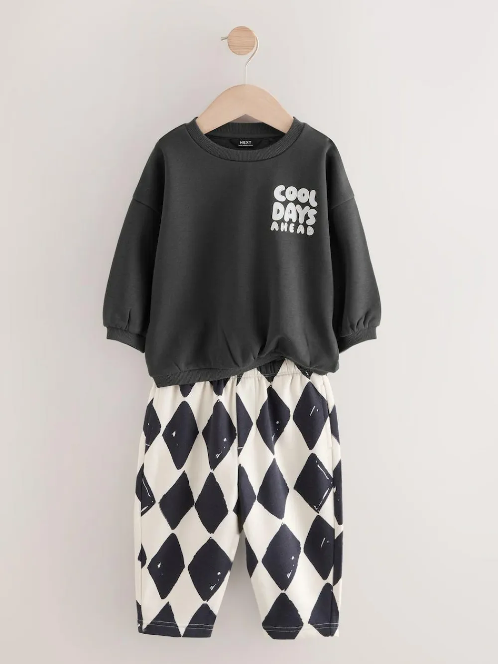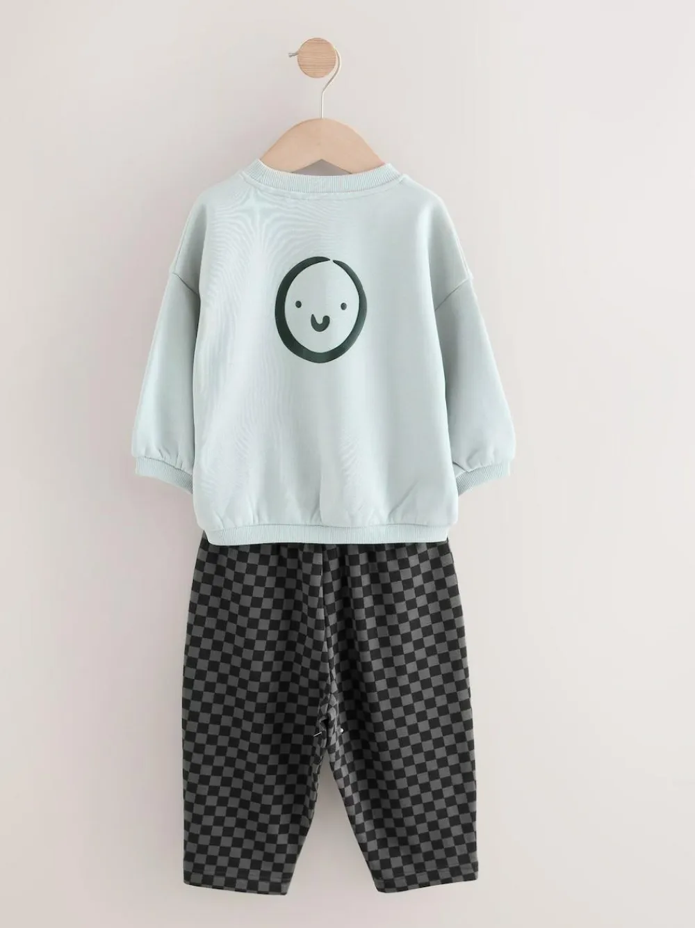 Our sweatshirt and stripes joggers set was made for having effortless styling. This two-piece set is made from breathable cotton and features a black sweatshirt and stripey printed joggers. Perfect for his outdoor adventures, add this to his rotation for a seamlessly stylish look. Two piece set 100% Cotton Sweatshirt with a smiley face Elasticated joggers Pockets Machine washable. Sweater light grey, Jogger checkerboard, Sweater charcoal and Jogger Harlequin 80% Cotton, 20% Recycled polyester.