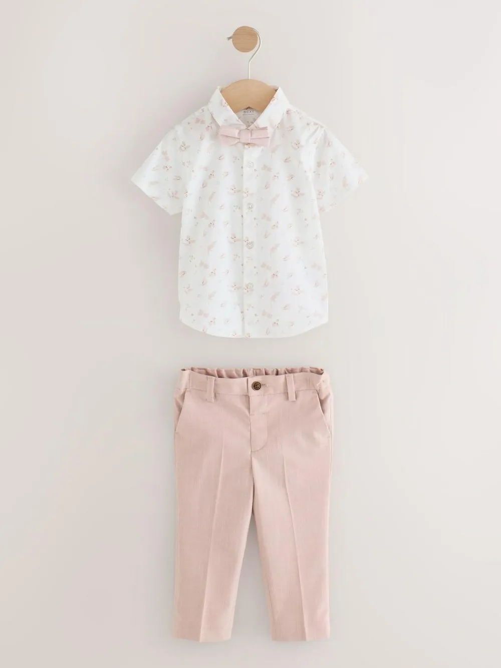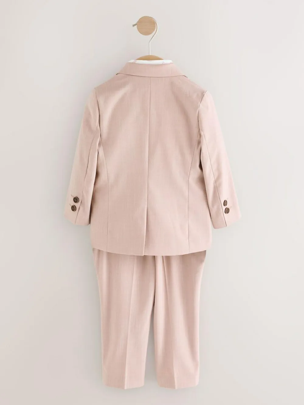 Your little one will look smart and stylish in this handy formal set, featuring a button-up shirt, a velvet bow tie, a single breasted blazer jacket with a lapel collar and coordinating center-crease trousers. Ideal for weddings, parties and special occasions. Regular fit 4-piece set Button up cotton shirt Velvet bow tie Single breasted blazer with lapel collar Smart trousers Jacket Main 67% Polyester, 31% Viscose, 2% Elastane. Lining 100% Polyester. Shirt and Bow Tie 100% Cotton. Trouser 67% Polyester, 31% Viscose, 2% Elastane.