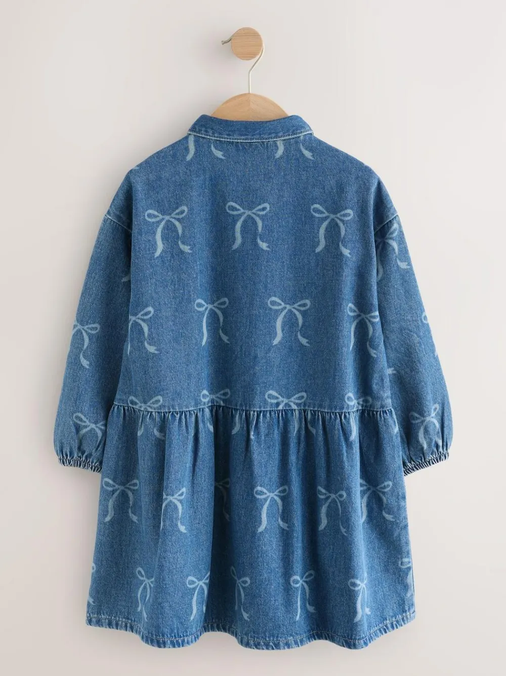 This charming denim blue shirt dress is a fun and stylish addition to her wardrobe. The playful bow diamante print and tiered skirt add a feminine touch, while the classic collar and full button fastening provide a smart finish. It’s a versatile choice for a casual day out or a dressier occasion. Denim fabric Bow diamante print Shirt dress style Long sleeves Tiered skirt Button fastening 100% Cotton.