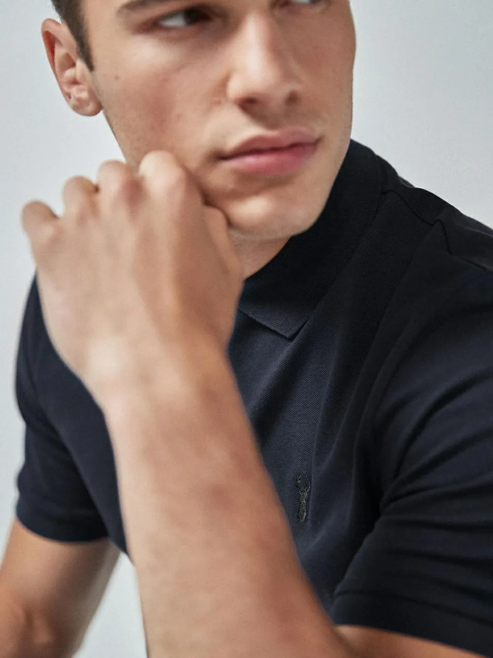 A wardrobe staple, our polo shirt in blue navy is made from soft cotton pique for your comfort throughout the day. This classic silhouette can be dressed up or down to suit the occasion and boasts a traditional button-fastened placket on the neck, ribbed collar and cuffs and a stag embroidered detail on the chest. Smart casual staple Soft construction Dual-button neck Pointed collar Short sleeve 95% Cotton, 5% Elastane.