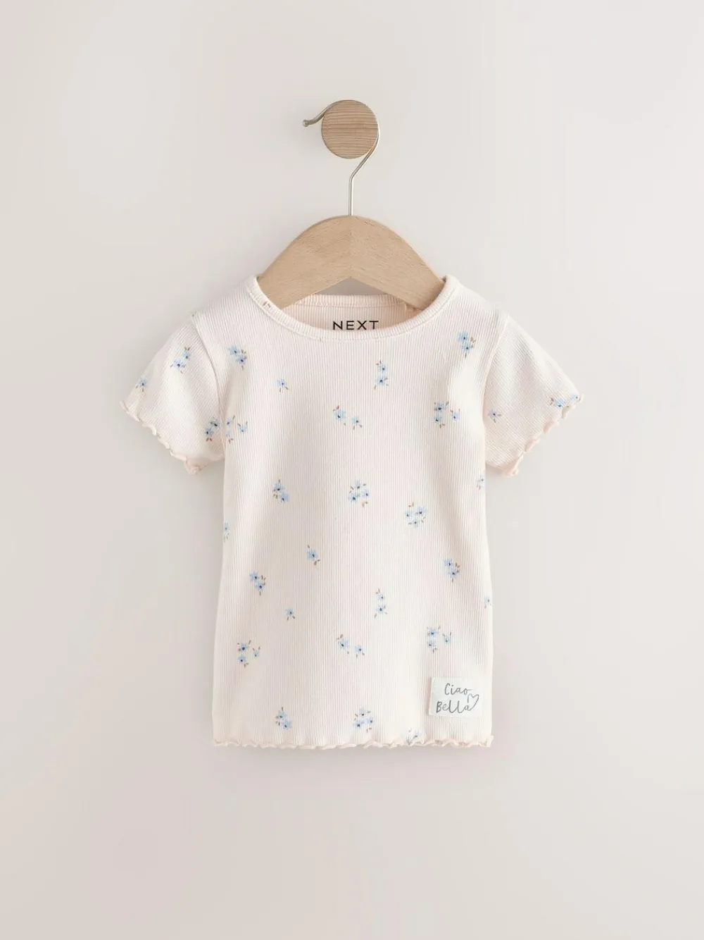 Bloom into summer with our 5 pack of cotton rich short sleeve tops. In an array of floral and patterned prints, each piece has a ribbed texture and complete with lettuce trim piping. 5 pack Cotton rich blend Short sleeves Ribbed texture Machine washable. 5 x T-shirt 95% Cotton, 5% Elastane.