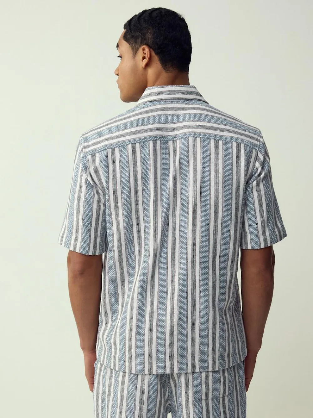 Embrace a relaxed summer style with this Blue Textured-Stripe Short-Sleeve Shirt. Crafted from comfortable cotton in a medium-weight fabric, it features a tactile textured stripe pattern. The cool revere collar, neat button-up fastening, and regular-fit make it the perfect breathable piece for casual warm-weather layering. Available in standard sizes. Crafted from cotton Distinctive textured stripe pattern Cool revere collar Button-up fastening Comfortable regular-fit Available in standard sizes Best for casual warm-weather wear Machine washable. 65% Recycled polyester, 35% Cotton.