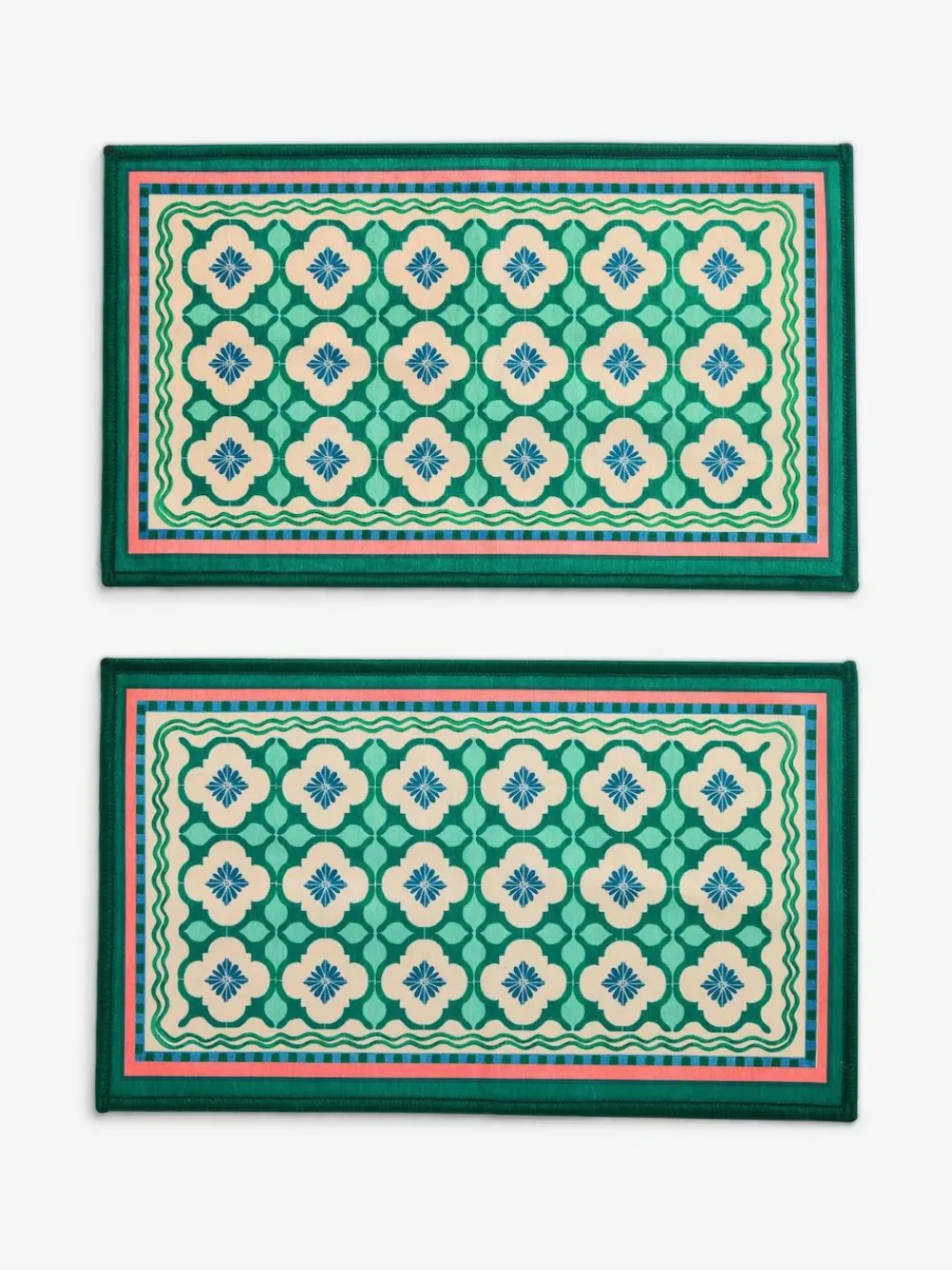 Brighten your home with this set of 2 tile-inspired indoor mats. Bursting with vibrant colours and patterns, these durable indoor mats are made from easy-care synthetic fibres. As a set of 2, they are ideal for multiple entrances or for convenience when one is in the wash. Made from easy-care synthetic fibres, they are fully machine washable. For indoor use only. Set of 2 Tile-inspired print Easy-care synthetic fibres Machine washable Indoor use only Machine washable. 100% Recycled polyester. Indoor use only.