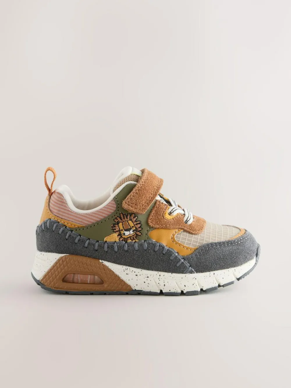 They’ll be ready for their next adventure in these cool brown Lion trainers. Featuring a comfortable memory foam insole, these trainers are built for all-day play. The fun Lion detail and secure fit, provided by both elastic laces and a touch and close fastening, make them a practical and exciting choice for everyday wear. Touch and close fastening Elastic laces Memory foam insole Lion detail Standard fit Durable sole View the How to Measure and Fit at Home Guide Upper – Leather, Other Materials, Lining & Sock – Textile, Sole – Other Materials.