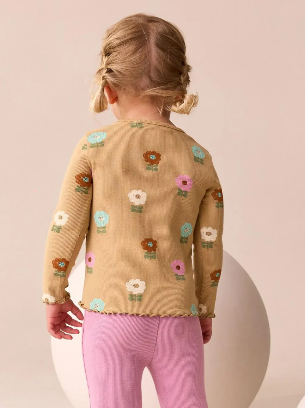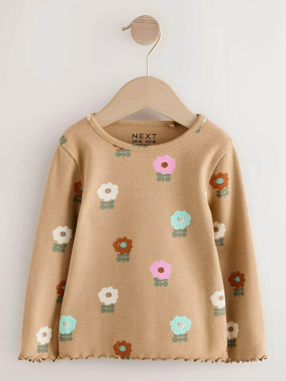 Add some fun to their everyday staples, with this long sleeve rib t-shirt, available in a selection of bright colours and prints, set against a cotton-rich base with added stretch. The t-shirt is finished with a ribbed crewneck collar and a ruffle trim the sleeve cuffs and hem. Cotton-rich blend Long sleeves Crewneck collar Ruffle trim Machine washable. 95% Cotton, 5% Elastane.