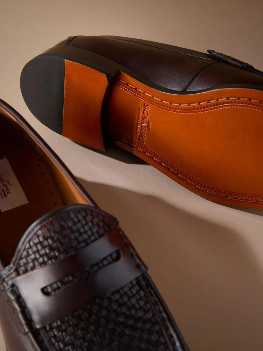 Step out in smart style with our brown signature loafers. Crafted from premium Italian leather upper, these loafer shoes feature a woven upper panel and stitch detailing. Ideal for weddings and formal events. Premium leather Slip-on style Woven panel Upper – Leather, Lining & Sock – Leather, Sole – Leather.