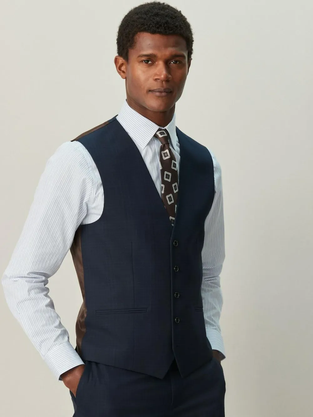 Complete your formal look with this sophisticated navy blue check suit waistcoat. Designed with five buttons and a stylish jacquard lining, the buckle adjuster ensures a perfect fit. Ideal for adding a refined layer to your suit or smart ensemble. Navy blue Five button fastening Jacquard lining Buckle adjuster on back Sleeveless waistcoat Main 69% Recycled polyester, 29% Viscose, 2% Elastane. Inner Lining 100% Recycled polyester. Outer Lining 100% Recycled polyester.