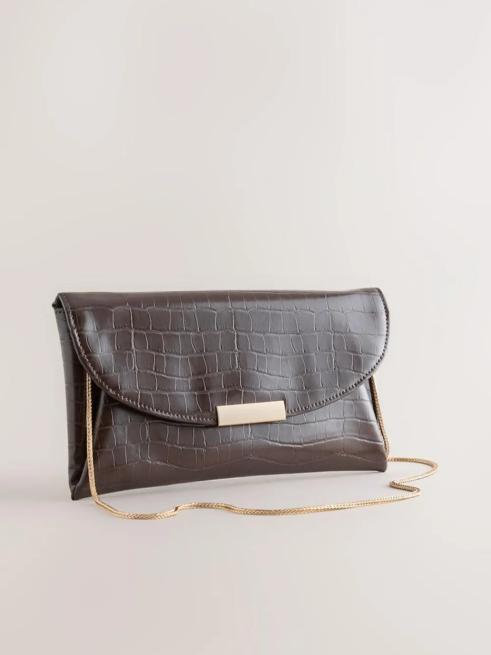 Add a pop of colour to your evening attire with this elegant clutch bag. Crafted from a soft fabric with a smooth, matte finish, it features a classic envelope-style front flap secured with a sleek silver-tone metal bar. The bag includes a delicate, removable chain strap, allowing you to carry it as a chic clutch or wear it over the shoulder for hands-free ease. Soft fabric construction for a refined finish. Chain included for versatile styling as a clutch or shoulder bag. Secure front flap with a modern silver-tone metal bar. Height 14.5cm Width 26cm Depth 2cm Main 100% PU. Lining 100% Recycled polyester.