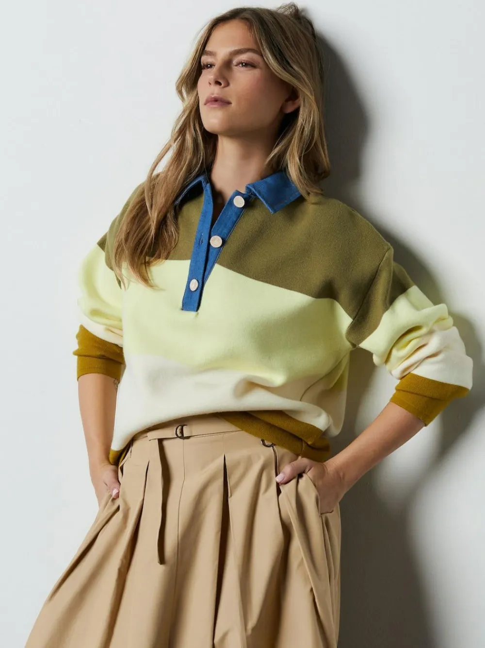 Upgrade your knitwear with this elevated polo neck jumper. The cosy soft-touch fabric and denim collar detail offer an on-trend contrast, perfect for autumn layering. Gold-tone metal buttons add a sophisticated touch to this comfortable and stylish long sleeve piece. Denim collar detail Cosy soft-touch fabric Long sleeves Gold-tone button fastening Polo neck Machine washable. 42% LENZING™ ECOVERO™ Viscose, 31% Polyester, 27% Nylon.