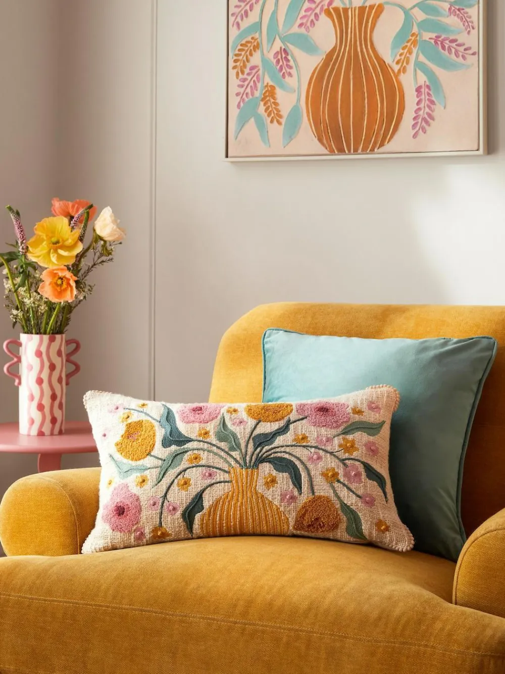 This beautiful embroidered cushion features Pink and Yellow flowers in a vase on natural woven base. A stunning addition to bring texture and colour to an accent chair or sofa. Rectangular cushion Vase design 100% cotton Height 50cm Width 30cm Face 100% Cotton. Reverse 100% Cotton. Inner Lining 100% Polypropylene. Polyester Pad Included.