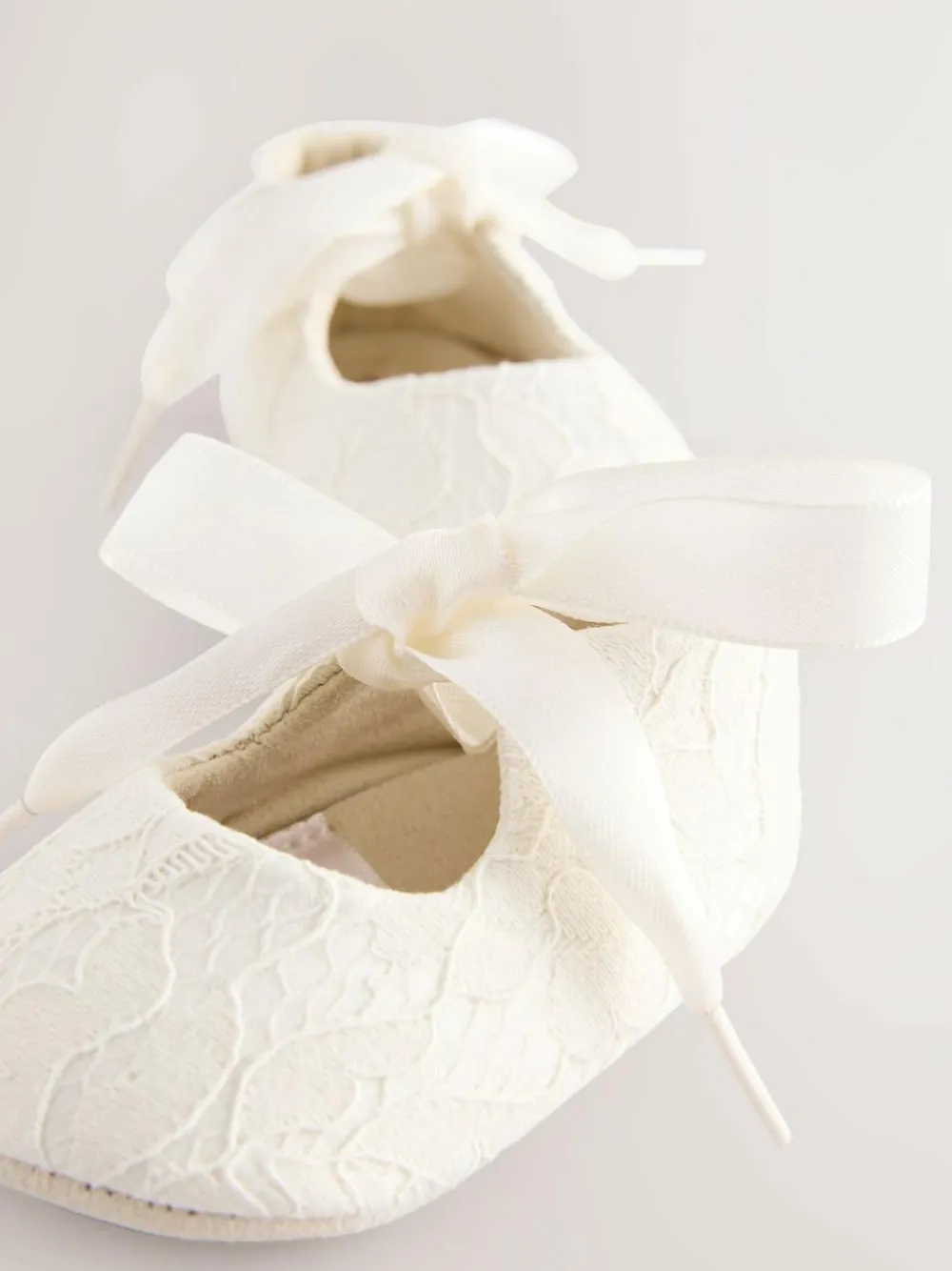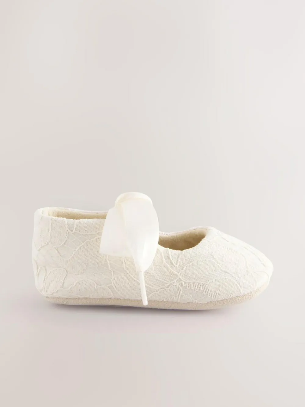 Perfect for weddings and special occasions, these cream baby shoes have gorgeous lace detailing to the upper and a ribbon tie, finished with a comfortable textile lining and a leather sole. Lace detailing upper Ribbon tie Textile lining Leather sole Upper – Textile, Lining & Sock – Textile, Sole – Leather.