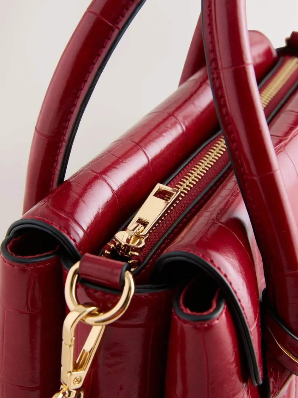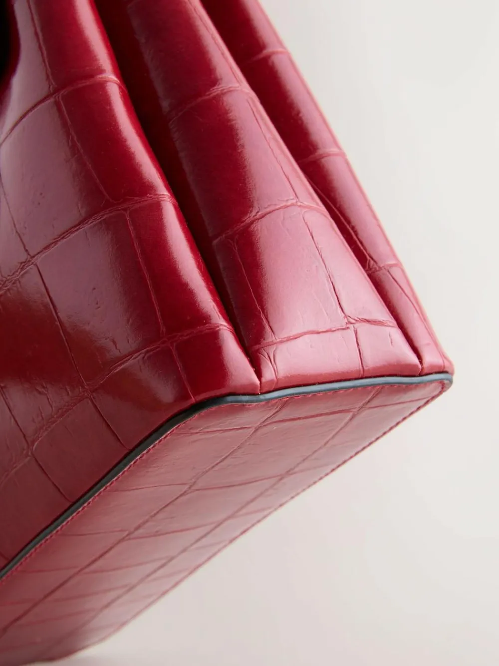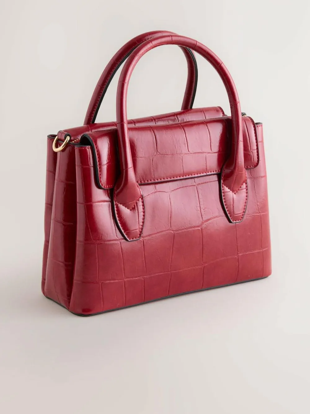 This vibrant red croc-effect bag has a high shine finish and is perfect for desk to dinner elegance. Features an optional strap for versatile, hands free wear. Hand-held bag Croc-effect finish Optional cross-body strap Front flap with clasp detail Zip fastening 3 compartments Height 20cm Width 25.5cm Depth 10cm Main 100% Polyurethane. Lining 100% Recycled polyester.
