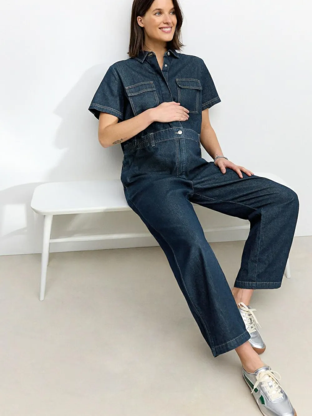 Go dark with your denim in our maternity denim boilersuit. Ultra-comfy with it’s elasticated waistband and popper fastening, it’s complete with side pockets, collar and short sleeves. The perfect wardrobe staple, style with trainers and a cool bag for an everyday look. 100% cotton Elasticated waistband Pockets Popper fastening Regular to fit inside leg 29″ / 74cm. Machine washable. 100% Cotton.