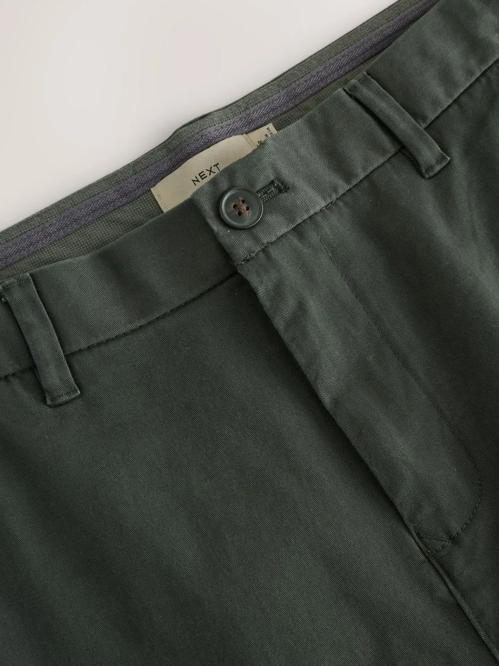 Refine your everyday wardrobe with these dark-green classic chinos. The cotton-rich fabric includes stretch for all-day comfort and movement. With a timeless look and practical pockets, they’re a versatile staple perfect for smart-casual events or the office. Straight fit Cotton-rich Stretch fabric Classic chinos style Button and zip fly fastening Belt loops Machine washable. 98% Cotton, 2% Elastane.