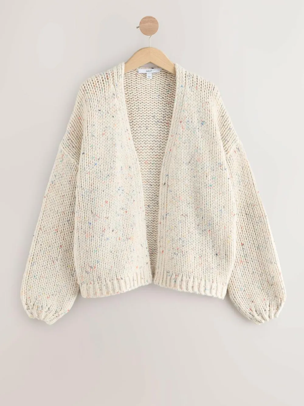 Make a statement with this chunky knit cardigan. Featuring voluminous long balloon sleeves for a modern silhouette, the effortless open-front design makes it a versatile, playful choice for brightening up your casual day-to-night wardrobe. Soft Touch Chunky Knit Open front/no fastenings Long balloon sleeves.. Machine washable. 66% Recycled polyester, 24% Acrylic, 5% Nylon, 5% Wool.