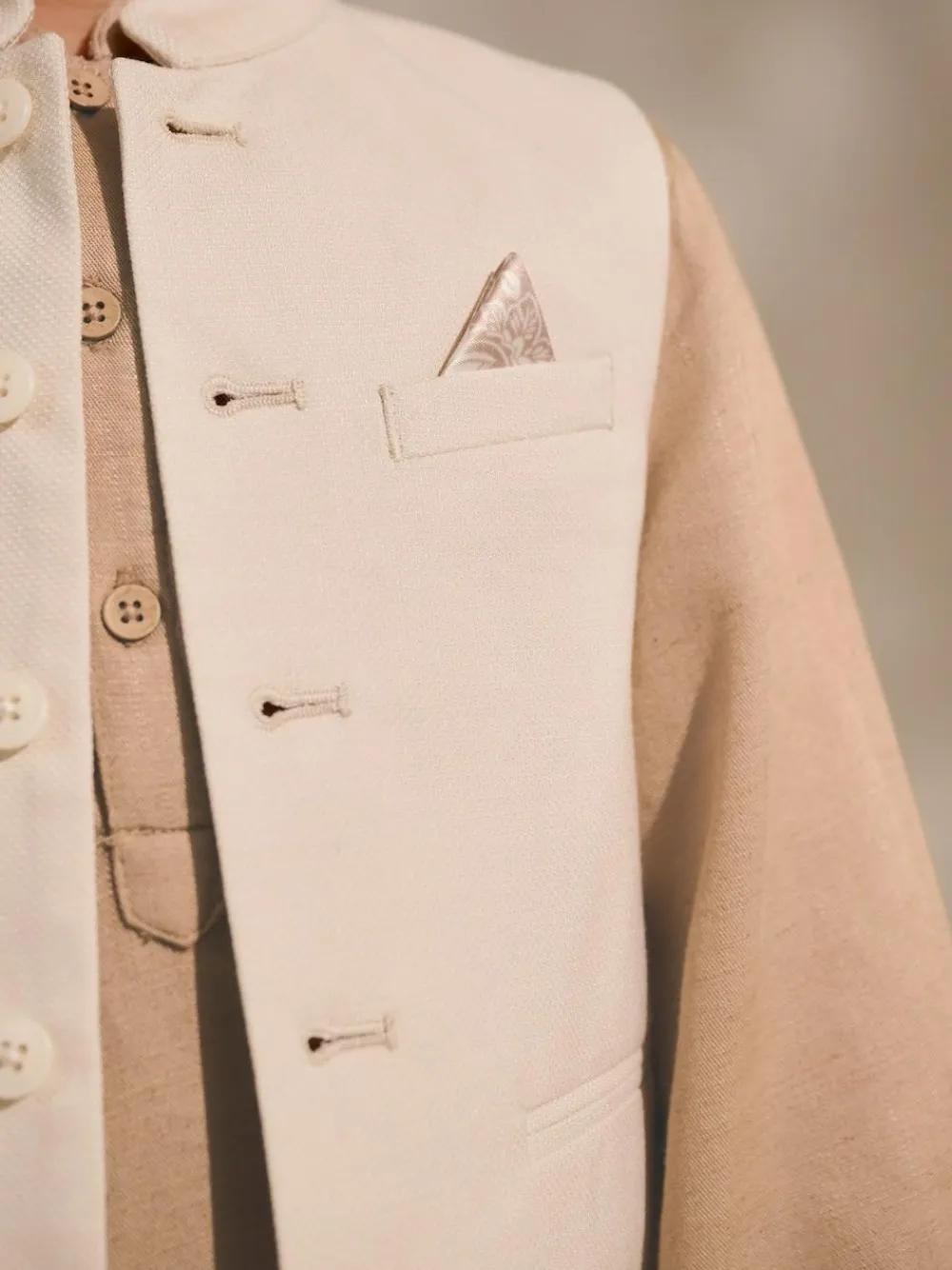 This smart ecru white waistcoat is the perfect finishing touch for his formal attire when celebrating Eid, made from a premium textured fabric with added linen. The waistcoat has a button-down fastening with a tall collar, a pull-out pocket square and trimmed front pockets. High neck Premium fabric Button-down fastening Textured feel Pocket square Front pockets Printed lining Main 85% Polyester, 13% Viscose, 2% Elastane. Lining 100% Polyester.