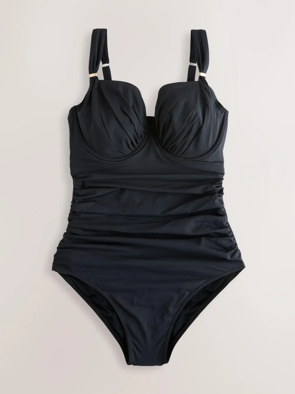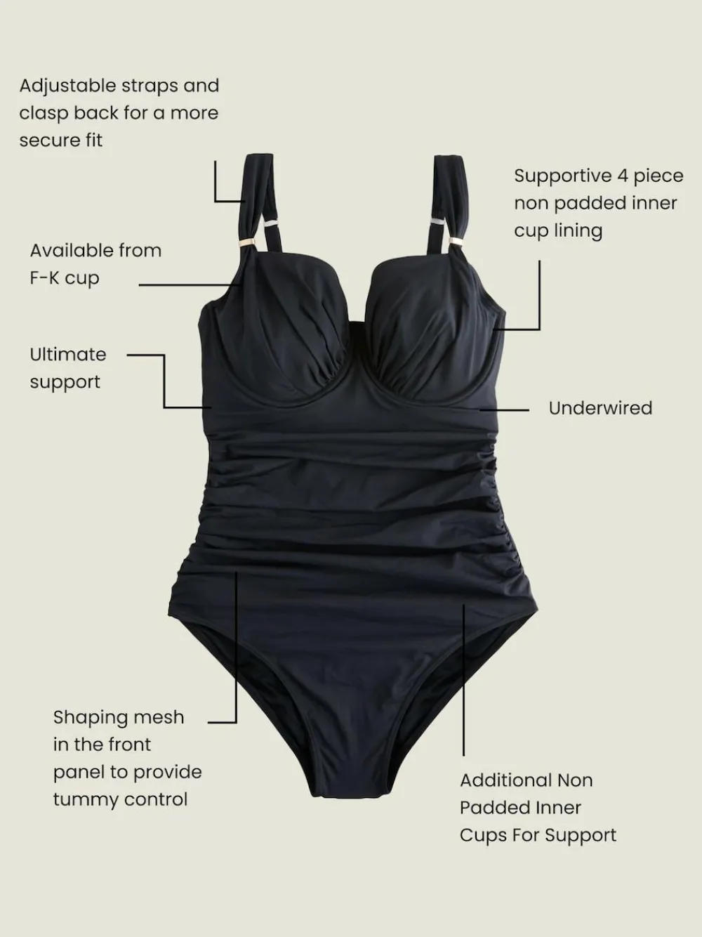 Comfortable, supportive and stylish, this swimsuit has been specially design for cup sizes F-K, boasting underwiring and a tummy control mesh for a shaped silhouette, durable shoulder straps and an SPF 50+ rated fabric for great protection from the sun on covered areas. Ultimate support Supportive 4-piece cup Underwired Designed for sizes F-K SPF 50+ fabric Main 85% Nylon, 15% LYCRA® XTRA LIFE™ elastane. Mesh 88% Nylon, 12% Elastane. Lining 92% Recycled polyester, 8% Elastane. LYCRA® XTRA LIFE™ fibre keeps your underwear looking new for longer, with lasting comfort and fit. This innovative stretch fabric is lightweight and breathable and will hold its shape wear after wear, wash after wash. , This fabric complies with BS EN 13758 – 1, providing protection against solar ultraviolet radiation. It has been independently tested and given a UPF rating of 50+ which blocks more than 97.5% of UV rays. Important Advice: • Sun exposure causes skin damage • Only covered areas are protected • Always use a high protection factor sunscreen on any exposed areas of skin • The protection offered by this fabric may be reduced with use or if stretched or wet • Always rinse in fresh water after each use • Fabric provides UVA +UVB protection from the sun.