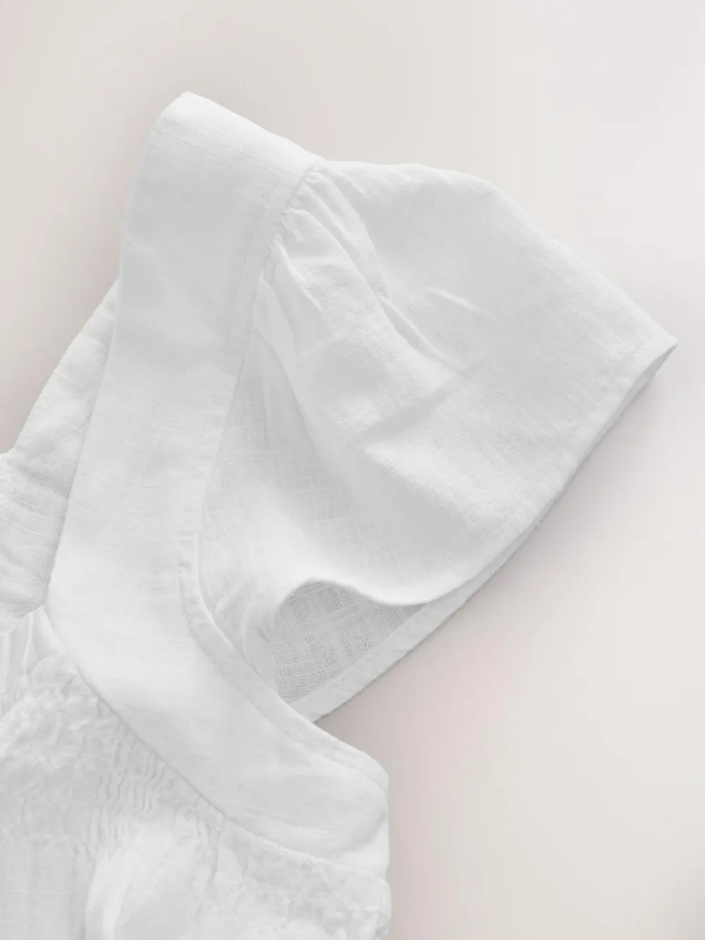 Discover a versatile wardrobe essential with this beautiful top, designed to elevate any look, perfect for everyday wear. Crafted from a soft, breathable linen blend fabric, it features a flattering square neckline and delicate smocking across the bust for a comfortable, shaped fit. The full front button placket and charming flutter cap sleeves add a touch of intricate detail and feminine grace. short sleeve button fastening linen blend everyday square neckline smocking across the bust flutter cap sleeves Machine washable. 70% TENCEL™ lyocell, 30% Linen. Items with the curve logo are available in sizes 18 and above.