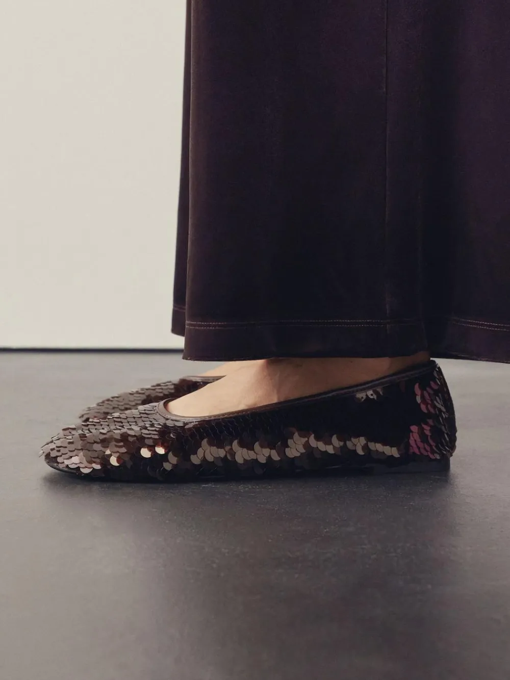 Shine at any occasion in these glamorous Chocolate Brown Sequin Forever Comfort® Round Toe Sequin Ballerina Flats. The all-over sequin upper delivers a dazzling touch of glitz. Designed for all-day elegance, the slip-on style features a classic round toe and superior cushioning from the Forever Comfort® padding. Sequin upper Round toe Slip-on style Forever Comfort® padding Upper – Textile, Lining & Sock – Textile, Other Materials, Sole – Other Materials.