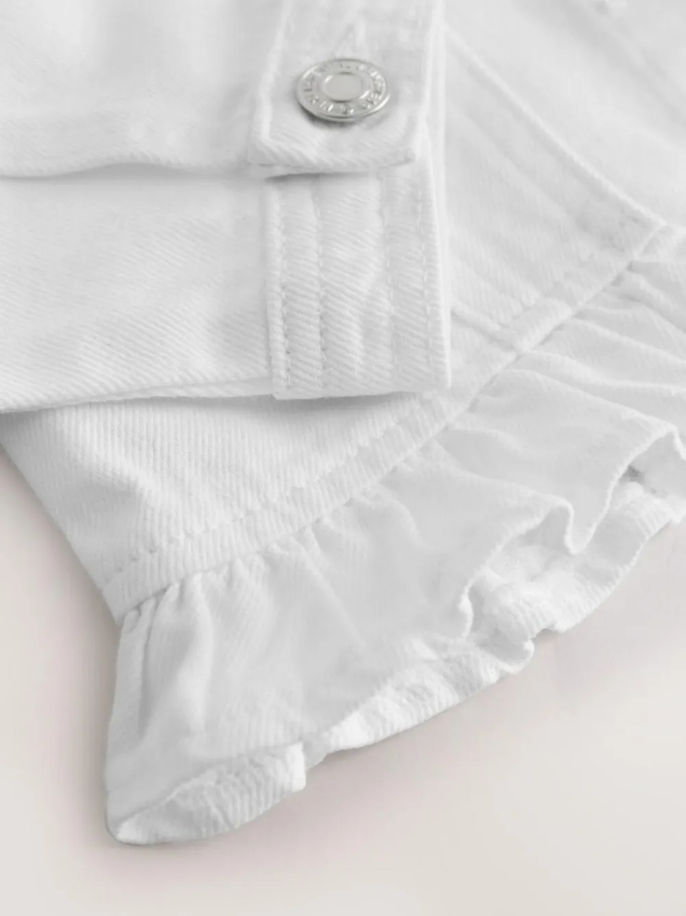 Your little one will love this white denim jacket, with adorable frill detailing to the shoulders, a button-up fastening and dual chest pockets, finished with long sleeves. Regular fit Frill detailing Denim fabric Button-up fastening Classic collar Machine washable. 100% Cotton.