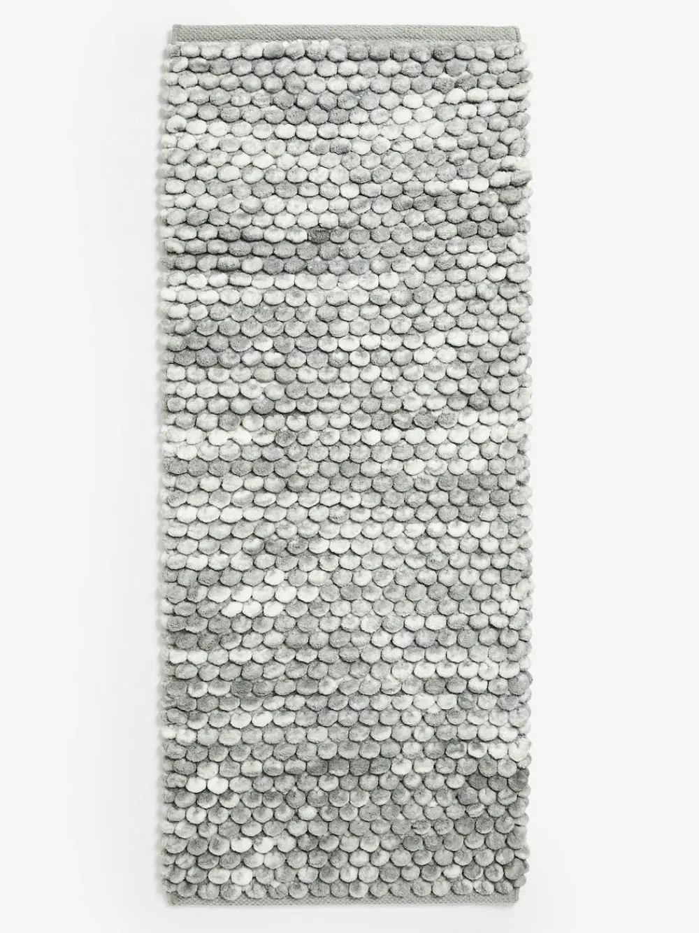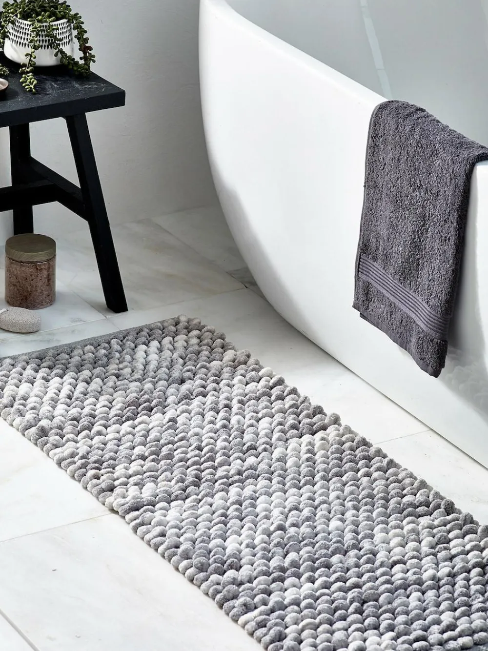 This giant bobble mat is made with a blend of cotton and polyester, meaning it is not only highly absorbent but also gives a luxuriously thick and soft feel under foot. Bobble texture Thick and soft Highly absorbent Due to the nature of the marl colour, slight colour variations may occur, giving each piece a unique finish. Length 45cm Width 110cm 82% Recycled polyester, 18% Cotton.