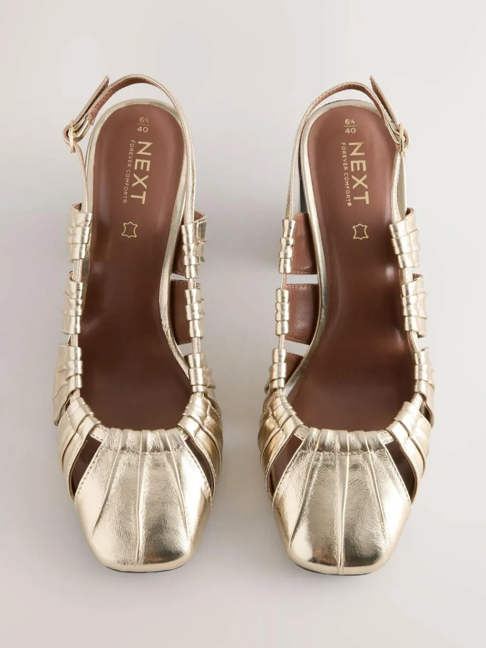 Radiate glamour in these sophisticated gold leather slingback heels. The striking slotted tab upper and contrasting dark block heel deliver a fashionable, polished look, while the signature Forever Comfort® padding ensures all-day wearability. Perfect for evenings out or elevating your smart-casual attire. Leather upper Slotted tab detailing on the upper Forever Comfort® padding Adjustable slingback design Heel height 9.5cm. Upper – Leather, Lining & Sock – Other Materials, Sole – Other Materials.