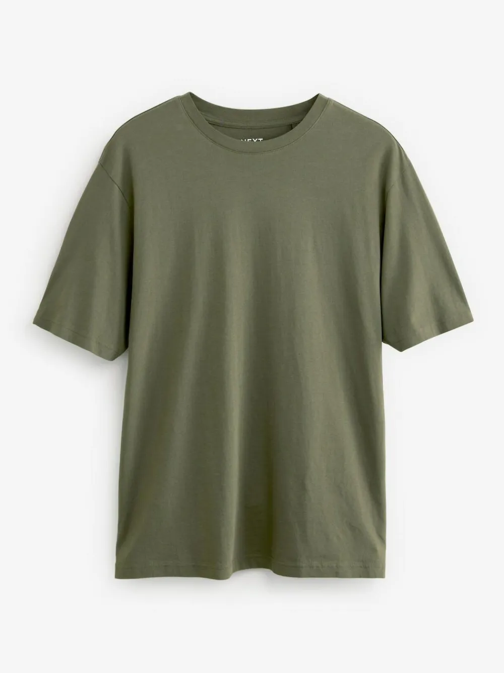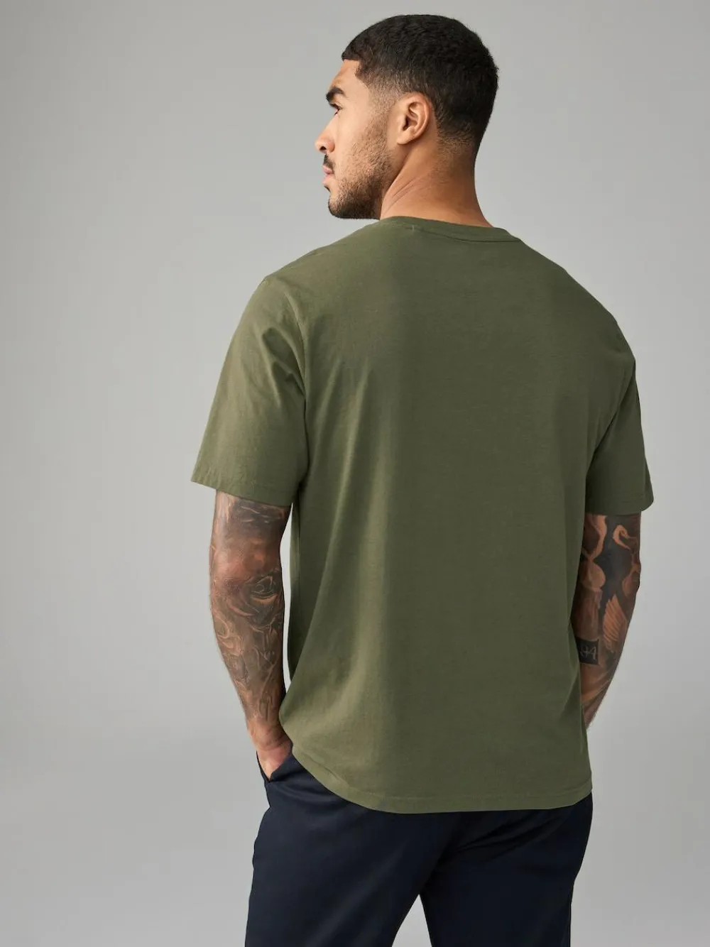 Our regular fit tee is easy to wear and fits straight down the body. Our essential green khaki t-shirt is the perfect easy-to-wear staple for your wardrobe. Made from pure cotton, it features a classic crew neck and short sleeves. Lightweight fabric – 160gsm Regular fit Ribbed crew neck Dual stitched hems Machine washable. 100% Cotton.