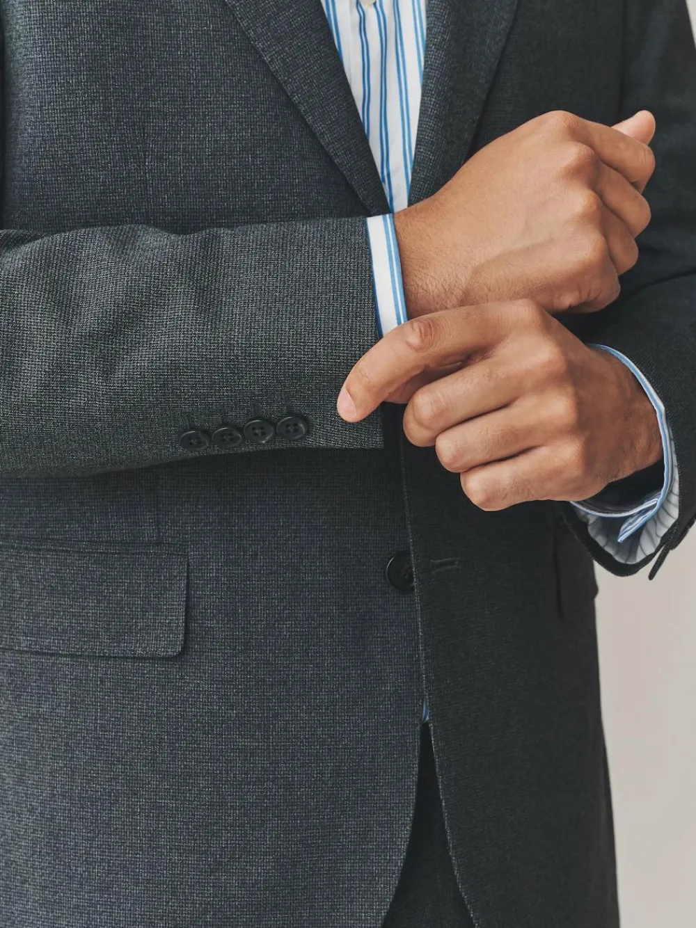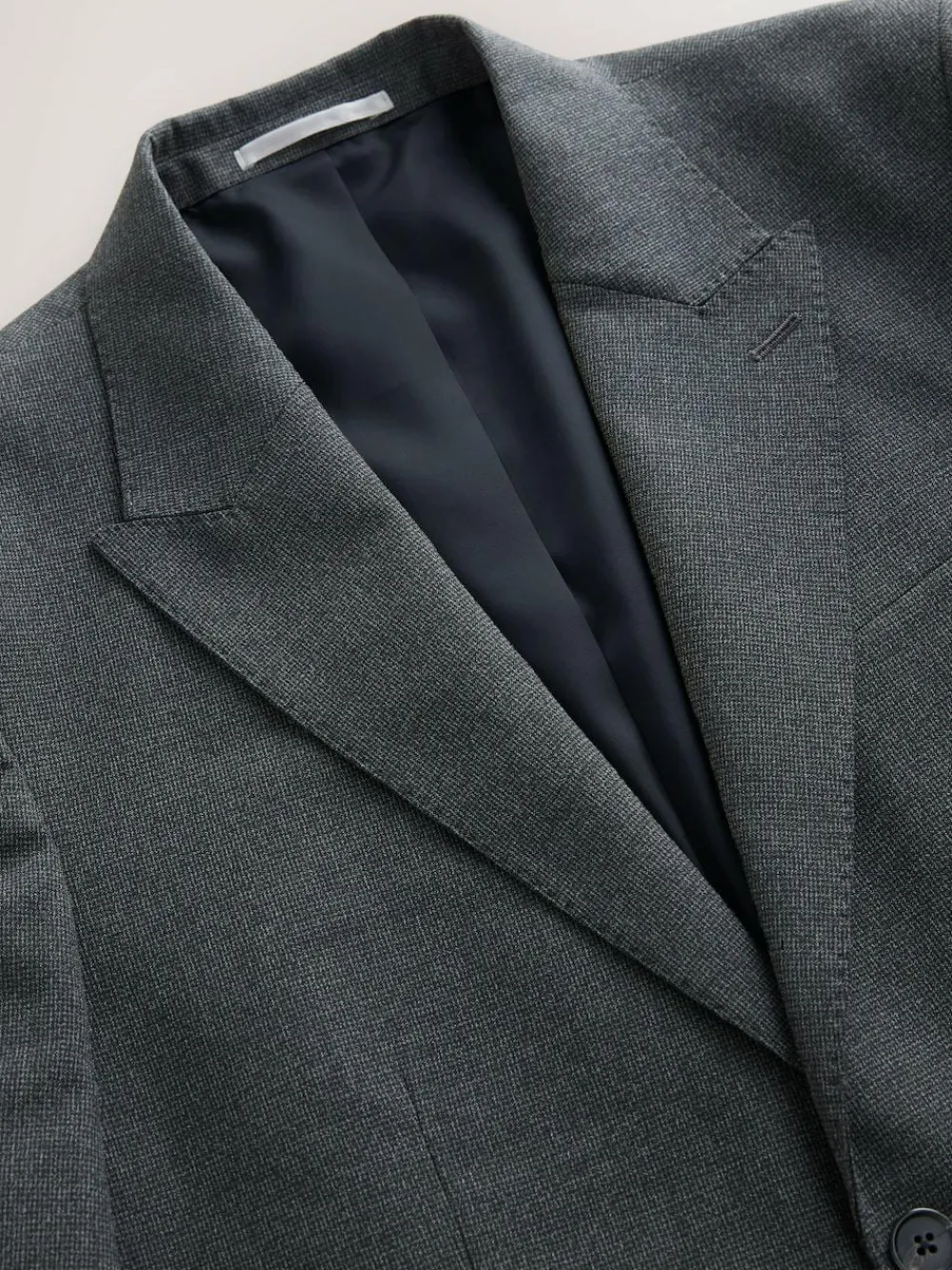Stay sharp in this grey, regular-fit suit jacket. The four-way stretch textured fabric provides ultimate comfort and movement, while the classic peak lapel and internal pockets offer a sophisticated and practical finish. A versatile piece perfect for both work and formal events. Regular fit Four-way stretch textured puppytooth fabric Peak lapel Internal pockets Check out The Suit Shop for more inspiration – https://www.next.co.uk/men/the-suit-shop Main 68% Recycled polyester, 28% Viscose, 4% Elastane. Lining 100% Recycled polyester.