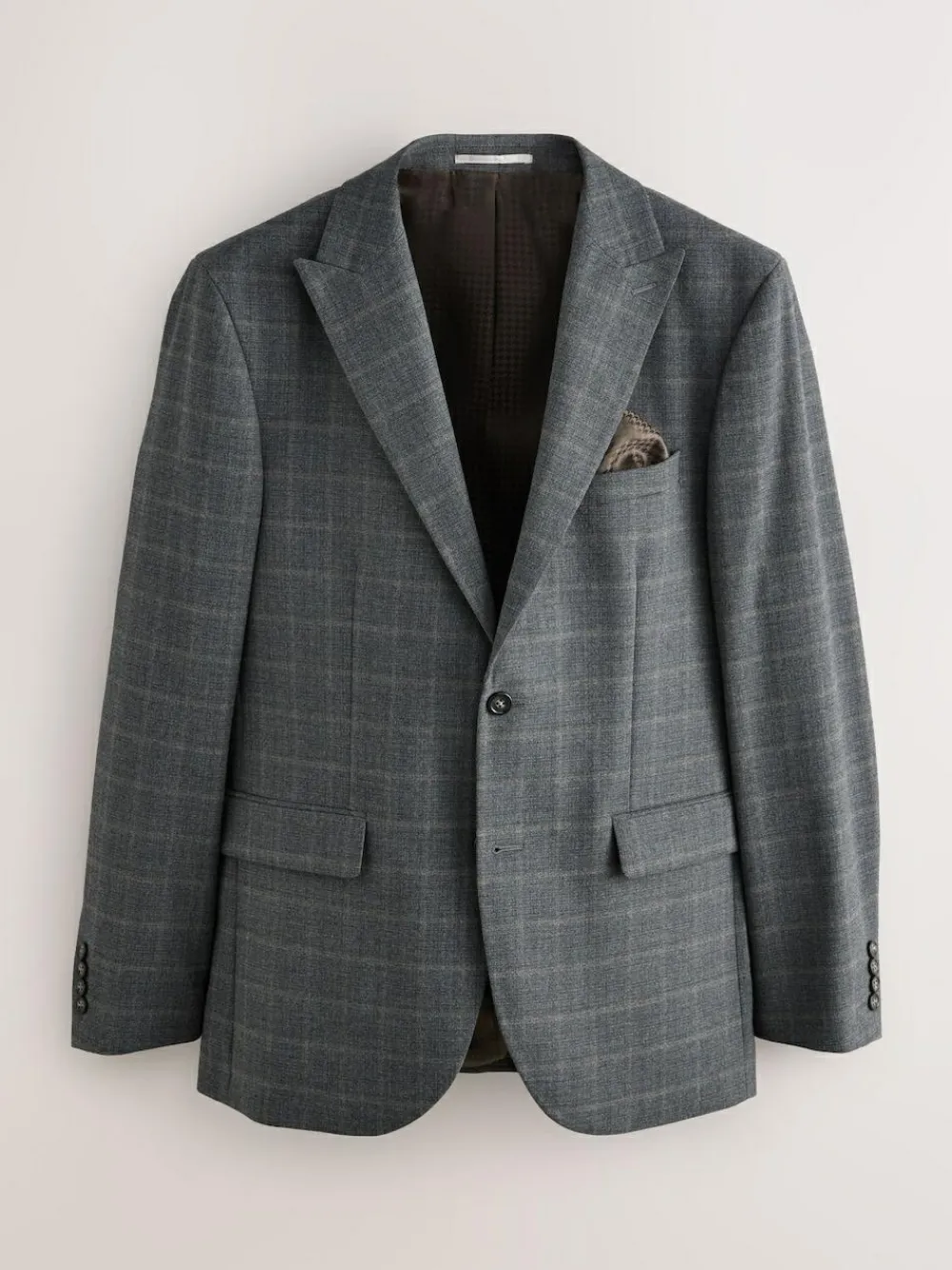 Step up your style with this tailored-fit, grey suit jacket, crafted from a sophisticated check flannel. Perfect for special occasions, its smart peak lapel, internal pockets, and pull-out pocket square offer a refined look. The elegant jacquard lining adds a final touch of luxury. Tailored fit Peak lapel Pull-out pocket square Internal pockets Jacquard lining Check out The Suit Shop for more inspiration – https://www.next.co.uk/men/the-suit-shop Main 69% Recycled polyester, 29% Viscose, 2% Elastane. Lining 100% Recycled polyester.