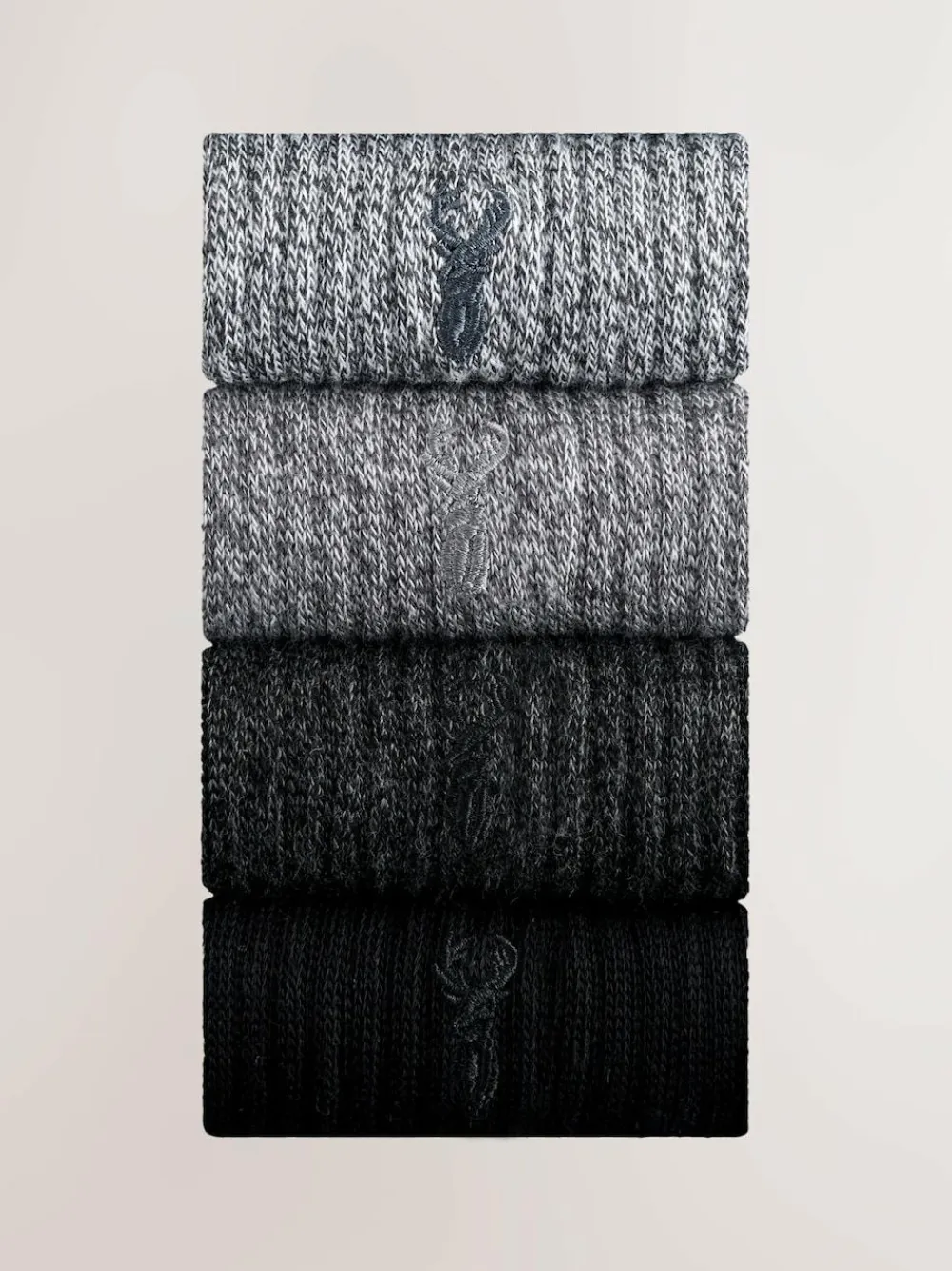 Get ready for your daily adventures with this 4-pack of embroidered socks. The twisted heavyweight fabric provides a cosy feel, while the full terry footbed offers added comfort for all-day wear. The pack includes a mix of plain and patterned socks, making them a versatile choice for everyday use. Twisted heavyweight fabric Full terry footbed 4 pack Ribbed ankle Stag embroidery Machine washable. 4 x Socks 85% Cotton, 13% Nylon, 2% Lycra® Elastane.