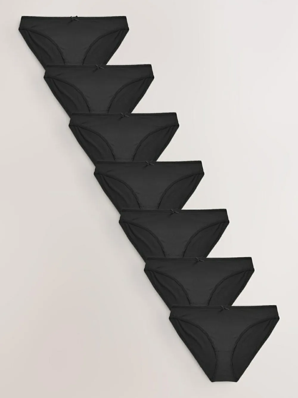 Meet your new everyday underwear with our seven-pack of microfibre knickers in black. Designed to provide that extreme comfort feeling, they’re crafted with an ultra-soft touch and sit comfortably on your hips for a flattering silhouette. The seamless construction makes them an ideal choice under fitted clothing. With seven pairs, you’ll have a fresh set for each day of the week. Pack of seven Microfibre stretch fabric Seamless construction Low-rise Elasticated waistband Bow detail at the front Cotton gusset Machine washable. 7 x Briefs Main 86% Polyester, 14% Elastane. Gusset 100% Cotton. Items with the curve logo are available in sizes 18 and above.