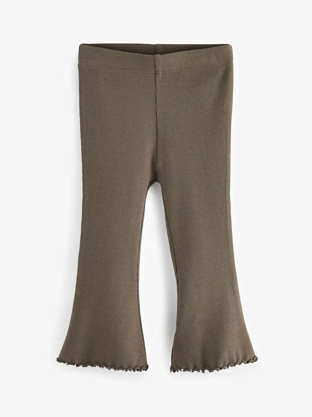 Level-up her everyday looks with our rib flare khaki green leggings. Made from a cotton rich blend for added comfort and finely finished with lettuce trim edges, an elasticated waistband and ribbed detailing. Ribbed cotton stretch fabric Elasticated waistband Pull-On style Wide-leg shape Lettuce trim edges Machine washable. 95% Cotton, 5% Elastane.