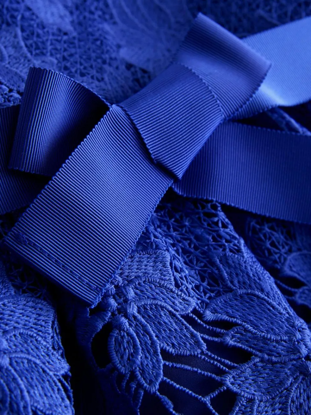 This lovely Cobalt Blue Lace Occasion Dress is a beautiful choice for formal events. The dress is made from a beautiful lace fabric and features a charming floral design. It is a lovely dress for occasions. The dress is sleeveless with a tie belt. Beautiful lace fabric Lovely dress for occasions Sleeveless design Tie belt at the waist Main 100% Polyester. Lining 100% Polyester.