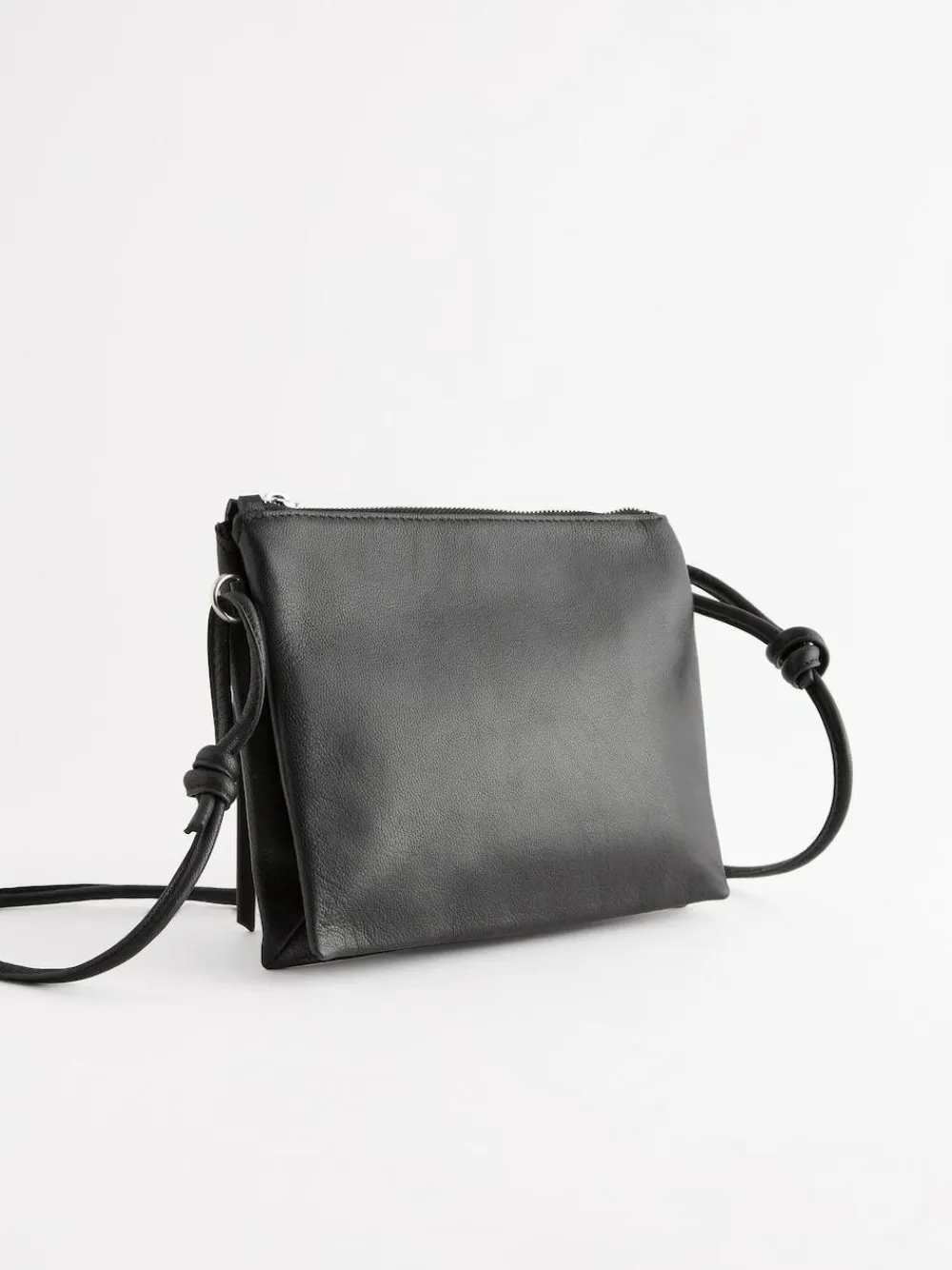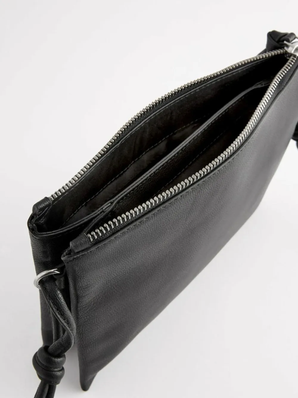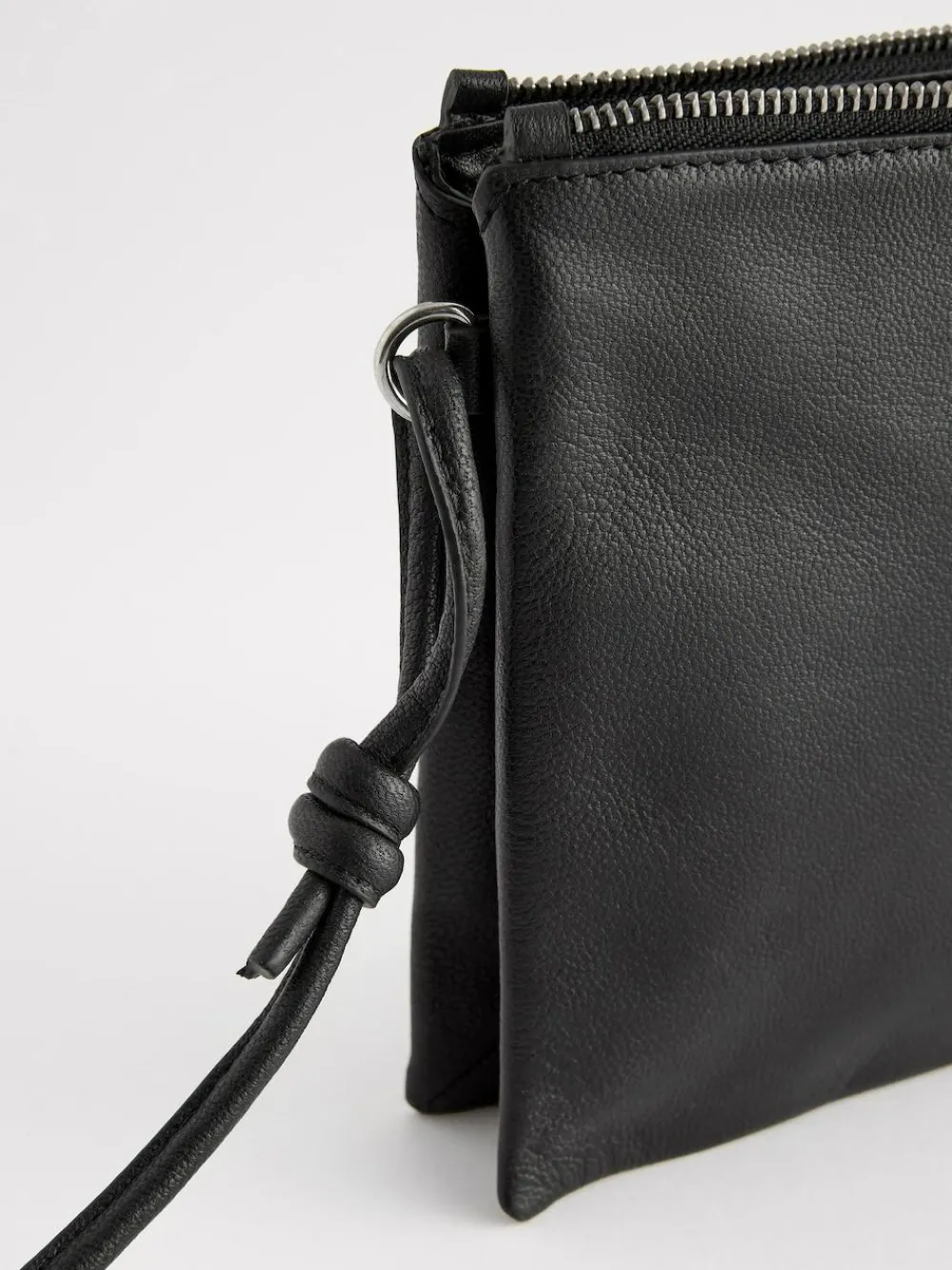 This leather cross-body bag features a sleek minimalist design, with knot and tassel detailing to the slim shoulder strap, finished with a main zippered compartment for your daily essentials. Leather construction Minimalist design Knot tassel detailing Slim shoulder strap Height 17cm Width 23cm Depth 5.5cm Main 100% Leather. Lining 100% Cotton.
