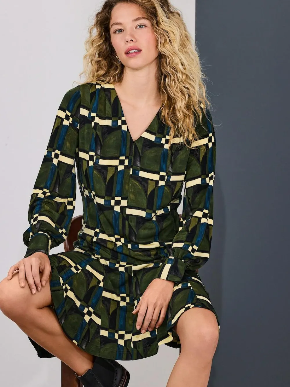 Next Long Sleeve A-Line Mini Dress Green Geo Print