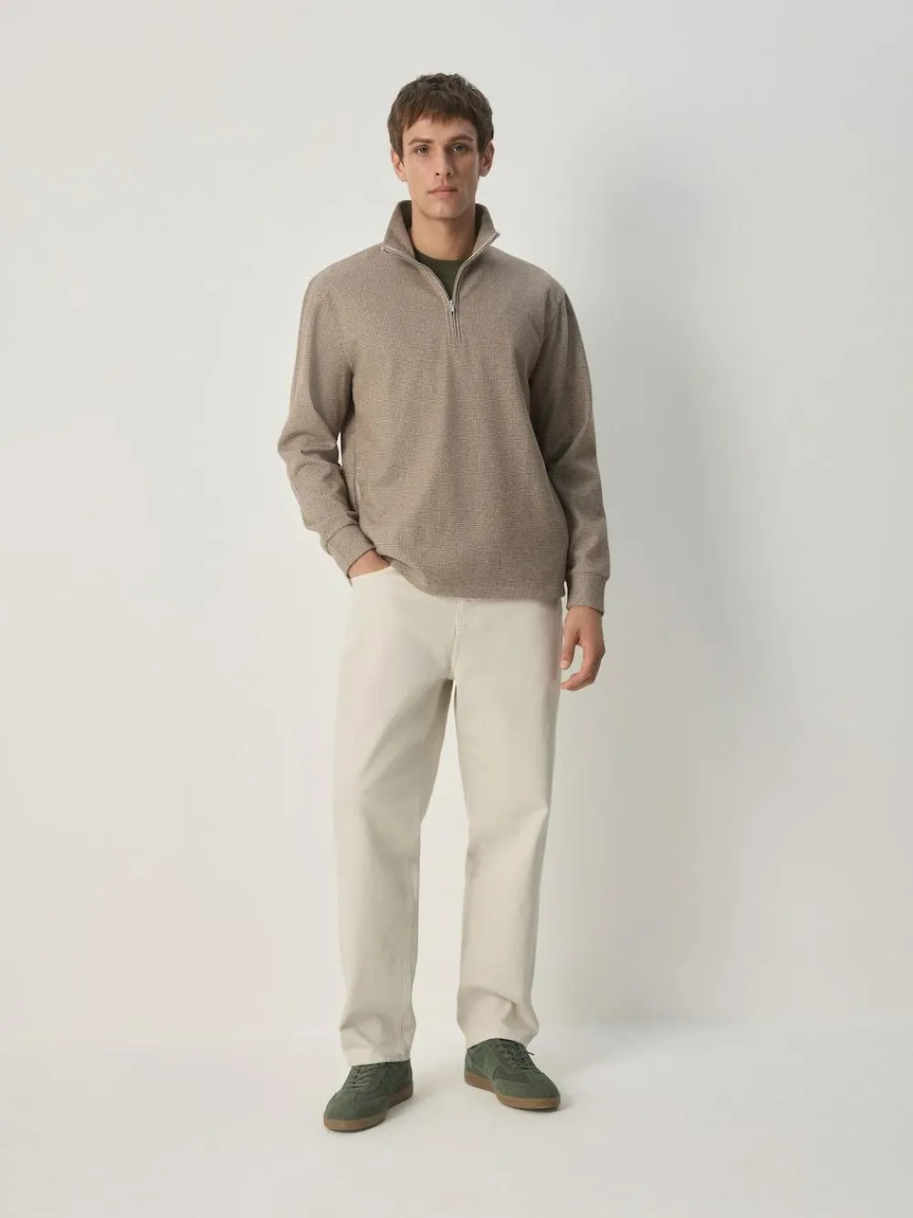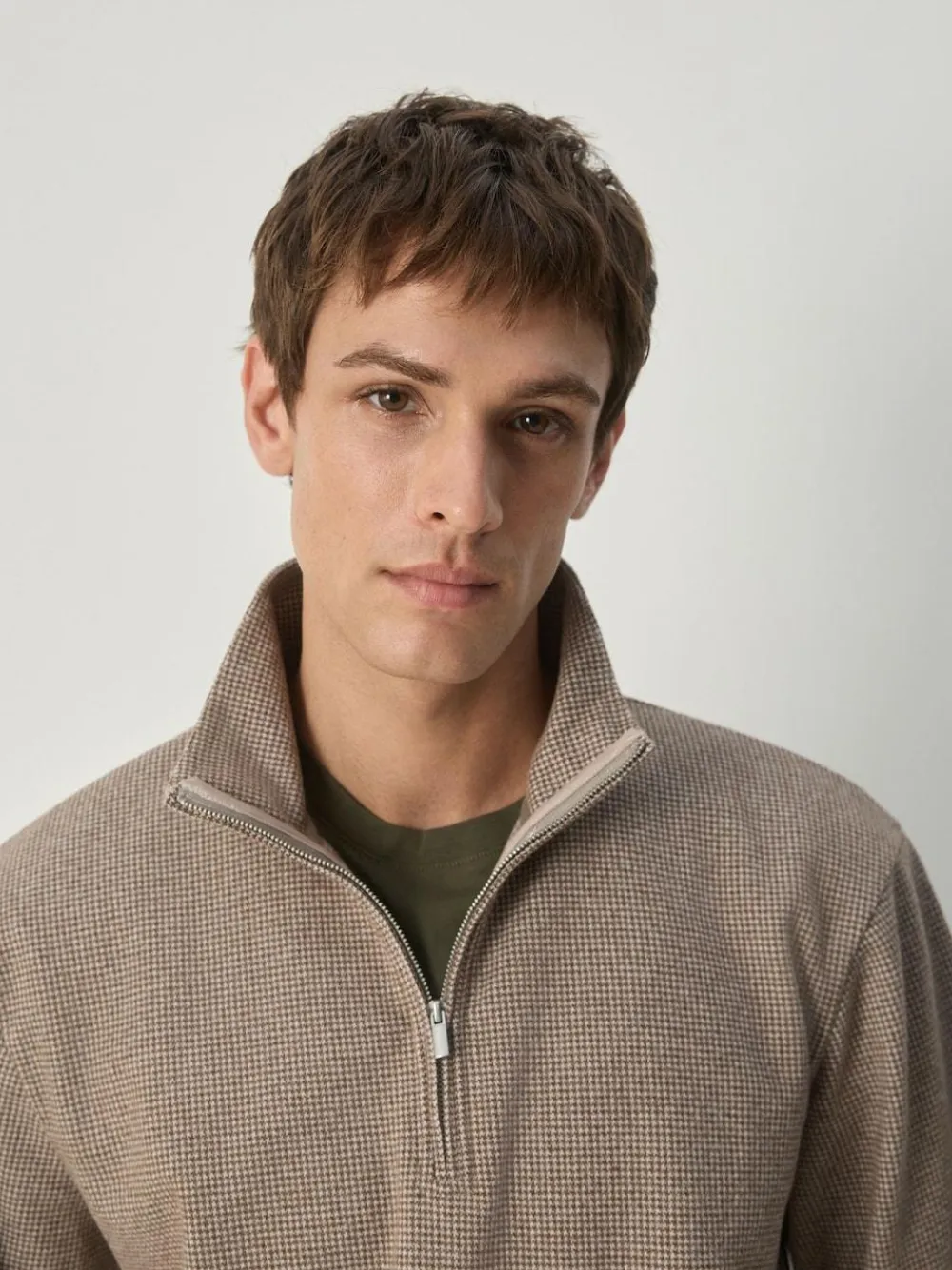 Made from a brushed soft-touch fabric featuring a neutral-brown dogtooth pattern with a zip neck, it’s perfect for layering up for a casual-but-put-together look. This versatile jumper is an easy, lightweight everyday staple for cool-weather dressing. Lightweight jumper Brushed soft touch fabric High neckline Zip-neck fastening Machine washable. 100% Recycled polyester.