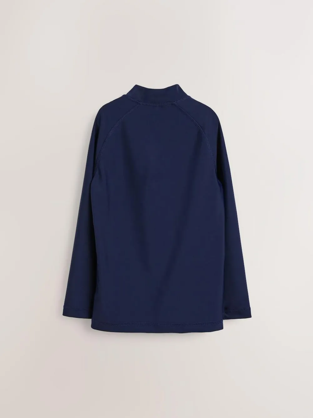 This navy blue long sleeve rash guard is made from a lightweight and stretchy fabric with a high neck. Perfect for the beach, these rash vests have a UPF rating of 50+ on covered areas to protect them from the sun, finished with a zip at the back of the neck. Long sleeve Lightweight Stretchy fabric High collar Zippered back fastening UPF rating of 50+ Machine washable. 82% Nylon, 18% LYCRA® XTRA LIFE™ elastane.