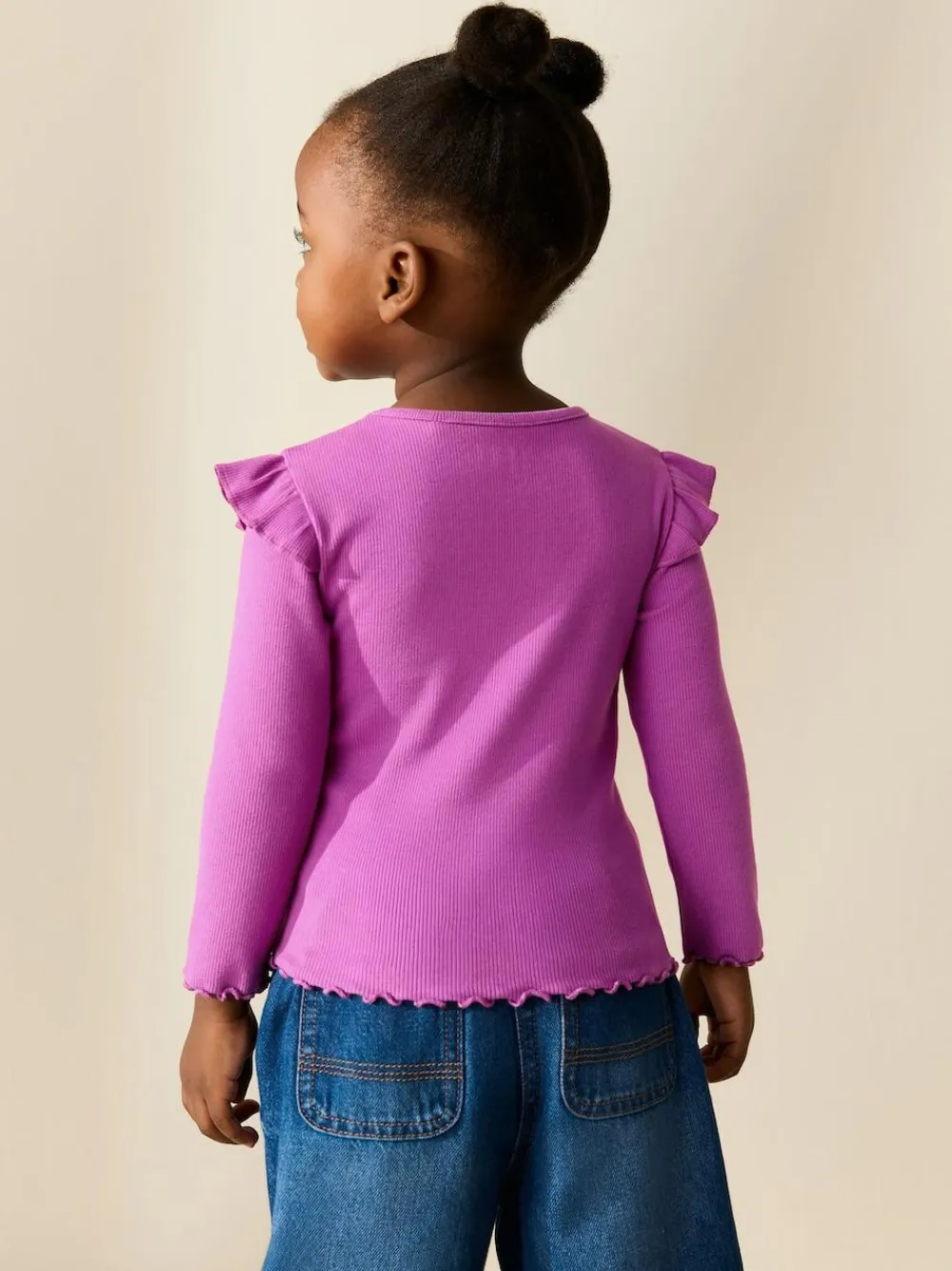 Brighten up their wardrobe with this charming top. Crafted from a comfortable ribbed fabric for a cosy feel, it features long sleeves finished with playful frill details on the shoulders. It is an adorable choice for adding colour to everyday outfits. Ribbed fabric texture Long sleeve design Playful frill sleeve detail Machine washable. 95% Cotton, 5% Elastane.