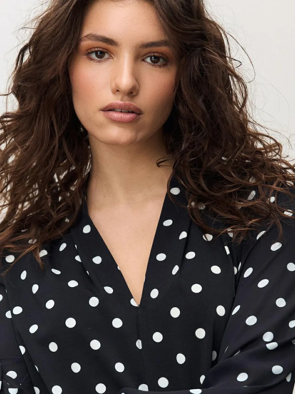 This blouse is a great transitional piece and can be worn from desk to dinner. It features long sleeves and an elegant V-neck design. Long sleeved V neck design Great transitional piece Can be worn desk to dinner Machine washable. Main 90% Recycled polyester, 10% Elastane. Woven 100% Recycled polyester.