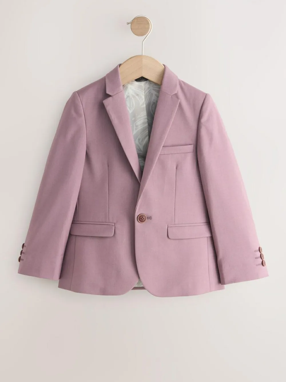 This sophisticated Mauve Purple Suit Jacket is a polished choice for special occasions. Designed in a modern skinny fit, the jacket features a classic notch collar and a streamlined single button fastening at the front. The smooth, mauve-coloured fabric is complemented by tonal button details on the cuffs and a practical chest pocket. Skinny fit for a contemporary silhouette Single button fastening Notch collar Mauve purple fabric with a subtle textured finish Fully lined with internal pocket detailing Main 74% Polyester, 24% Viscose, 2% Elastane. Lining 100% Recycled polyester.