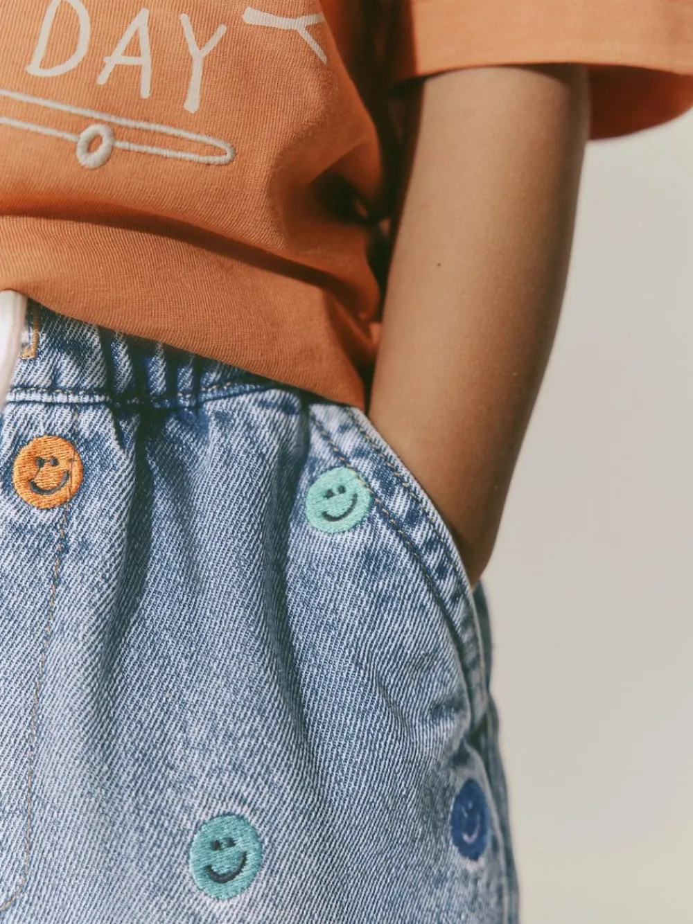 Made from pure cotton, these cool, loose fit jeans have an easy pull-on elasticated waistband, decorated with a multi-coloured embroidered design with side pockets and rear pockets. Loose fit 100% cotton denim Embroidered detailing Elasticated waistband Side and back pockets 100% Cotton.