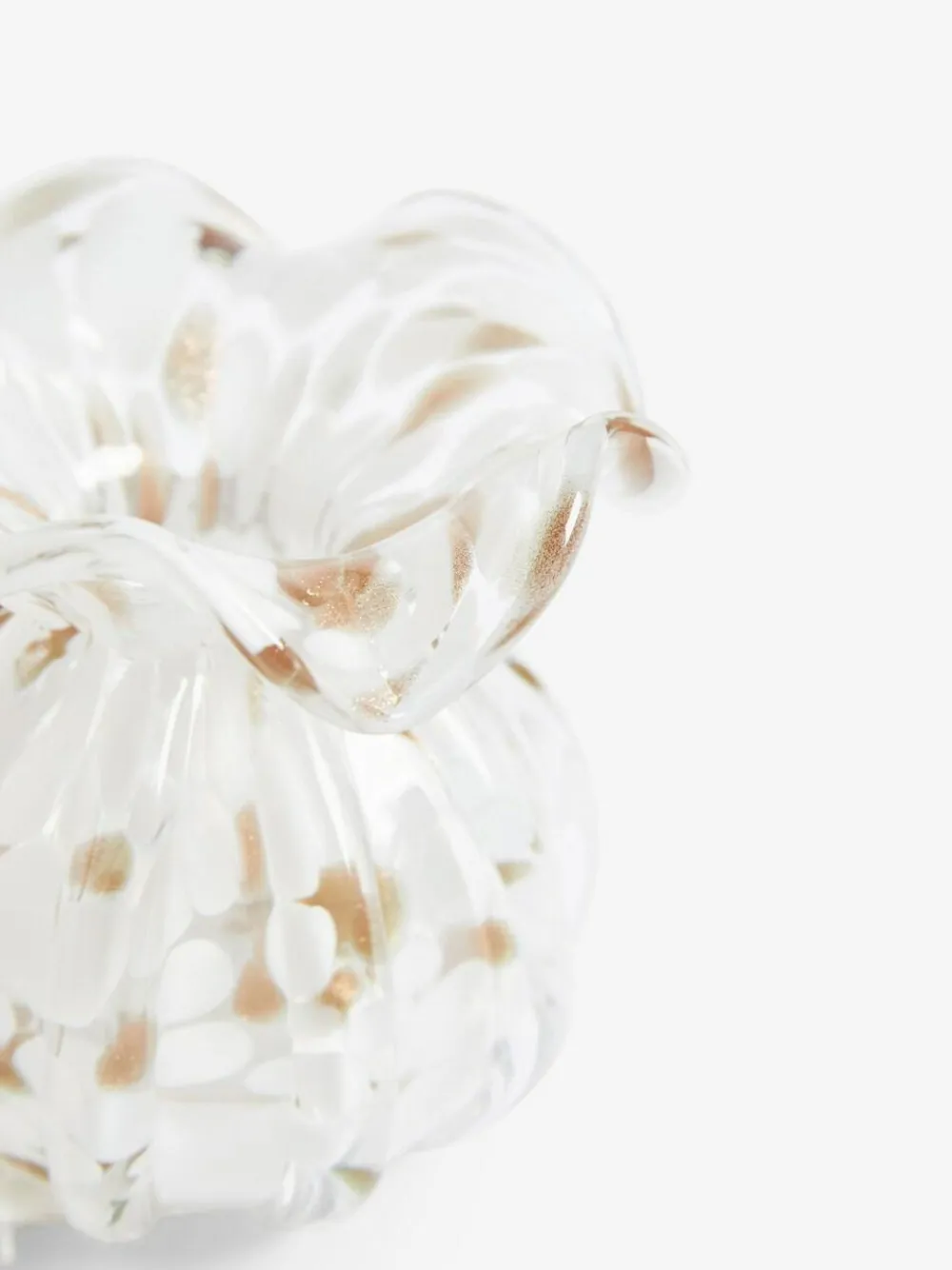This stunning glass confetti vase is a combination of a special glass-blowing technique with a layering of gold and white confetti dots to create eye-catching vessels. Suitable for fresh flowers or faux floral. Please note every item will be unique due to the technique. Glass confetti vase Gold and with confetti dots Height 10.5cm Width 10.5cm Depth 11.5cm 100% Glass.