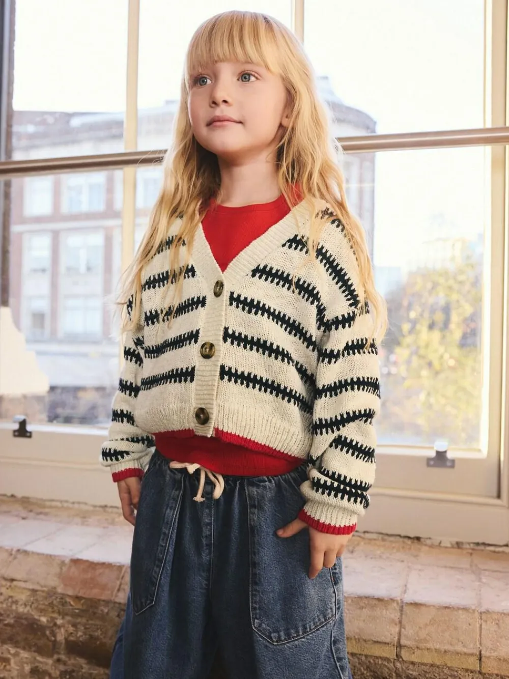 Add a vibrant layer to their outfit with this striped V-neck cardigan. The open stitch design and soft knit fabric create a light, textured feel. Featuring a V-neck button-down shape, it’s a perfect layering piece for adding a pop of colour and warmth to a dress or top. Open stitch cardigan Monochrome Stripe design V-neck button-down shape Long sleeves Cropped length Button fastening 100% Cotton.