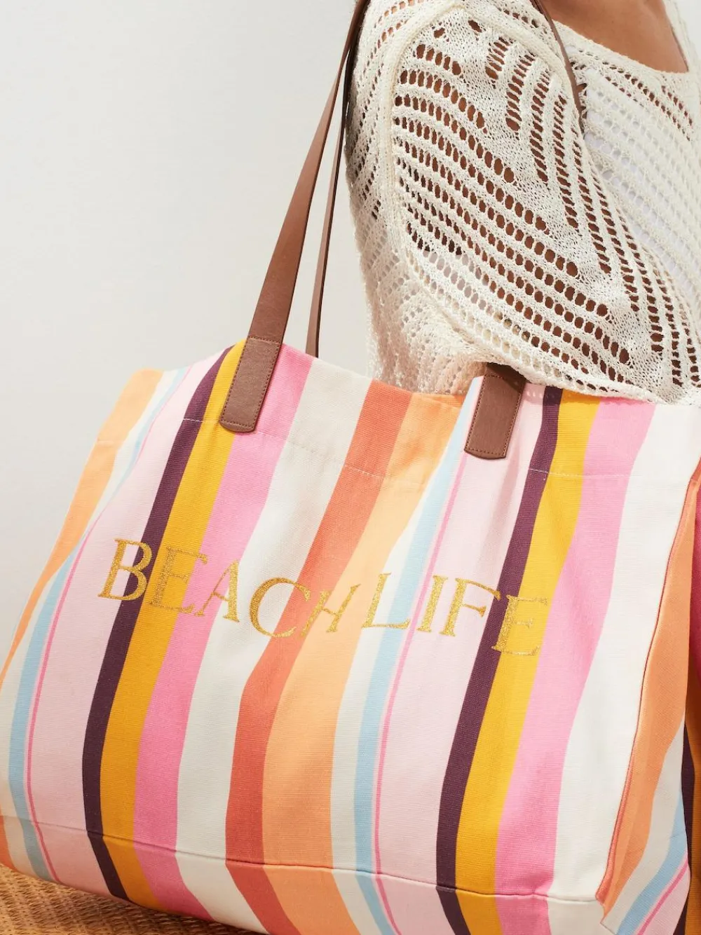 Big enough to carry all your beach essentials, our beach bag is a must-have. Made from durable cotton canvas, this oversized bag can effortlessly carry your towel, sun lotion, books and lunchtime picnic. With its fun design and faux leather this bag is fashionable and functional. Oversized Made from strong cotton canvas Leather effect PU strap Internal pockets Height 31cm, Width 63cm top edge, Depth 18cm Height 34cm Width 45cm Depth 19.5cm 100% Cotton.