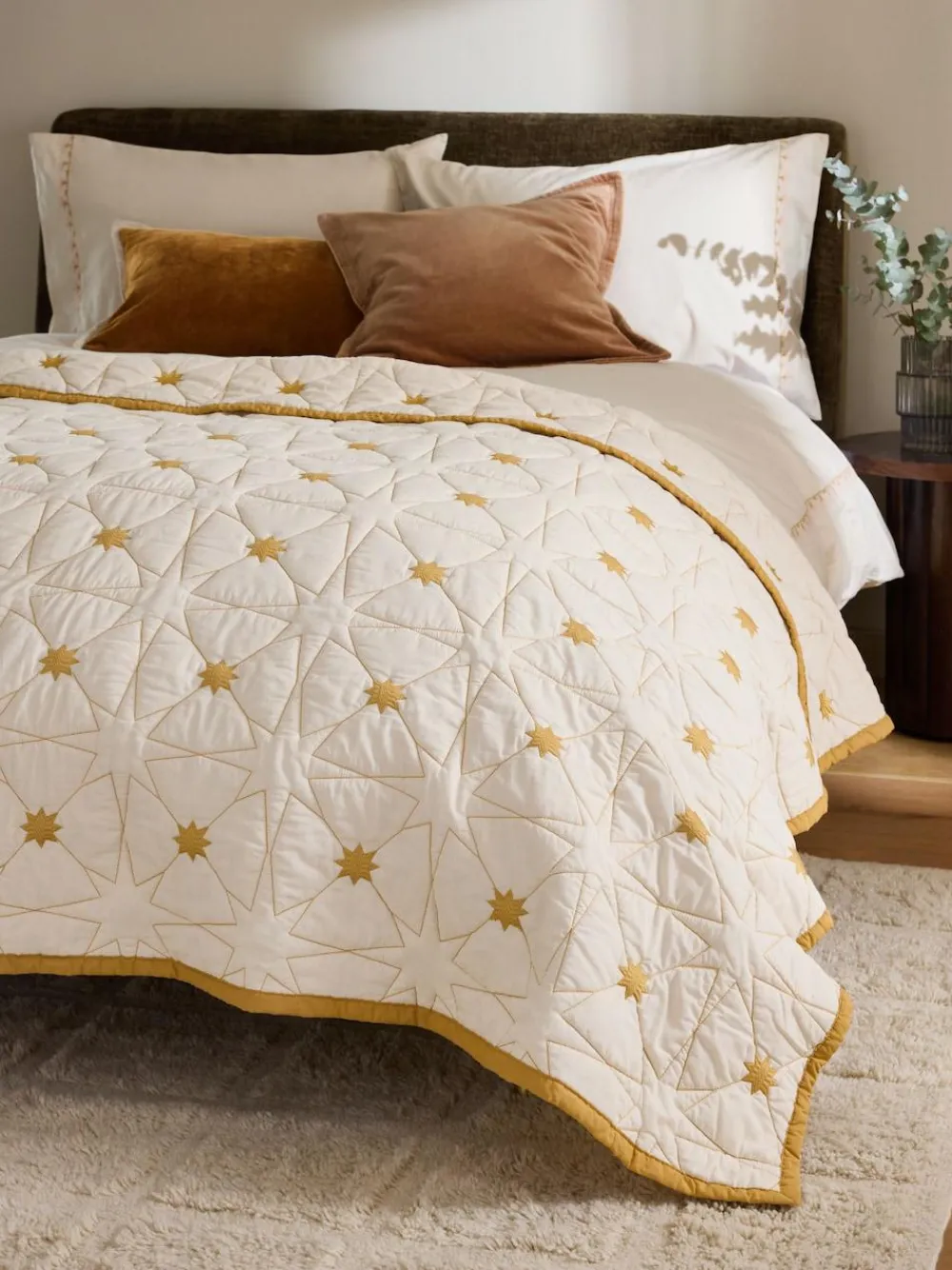 Elevate your room with our beautiful new star bedspread. This bedspread features a delicate star design that has been embroidered onto a soft natural base fabric. Finished with a matching ochre binding to pull the look together. Add our matching cushion to bring this look to life. Filling 100% Recycled polyester. Shell 100% Cotton. Throws are not fire retardant and should not be used as loose covers for upholstery.