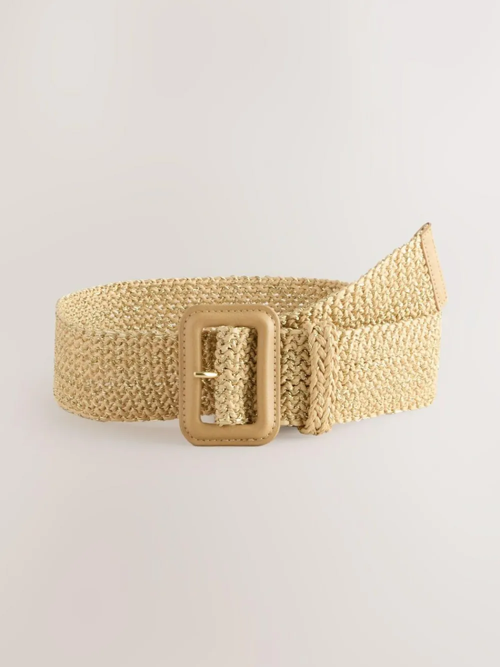 This wide waist belt is a great accessory for adding some shape to your outfit, in a gold-effect hue with an oversized buckle and a raffia woven texture. Wide shape Raffia woven texture Chunky buckle Main 57% Polypropylene, 43% Metallised fibre. Trim 100% Polyurethane.