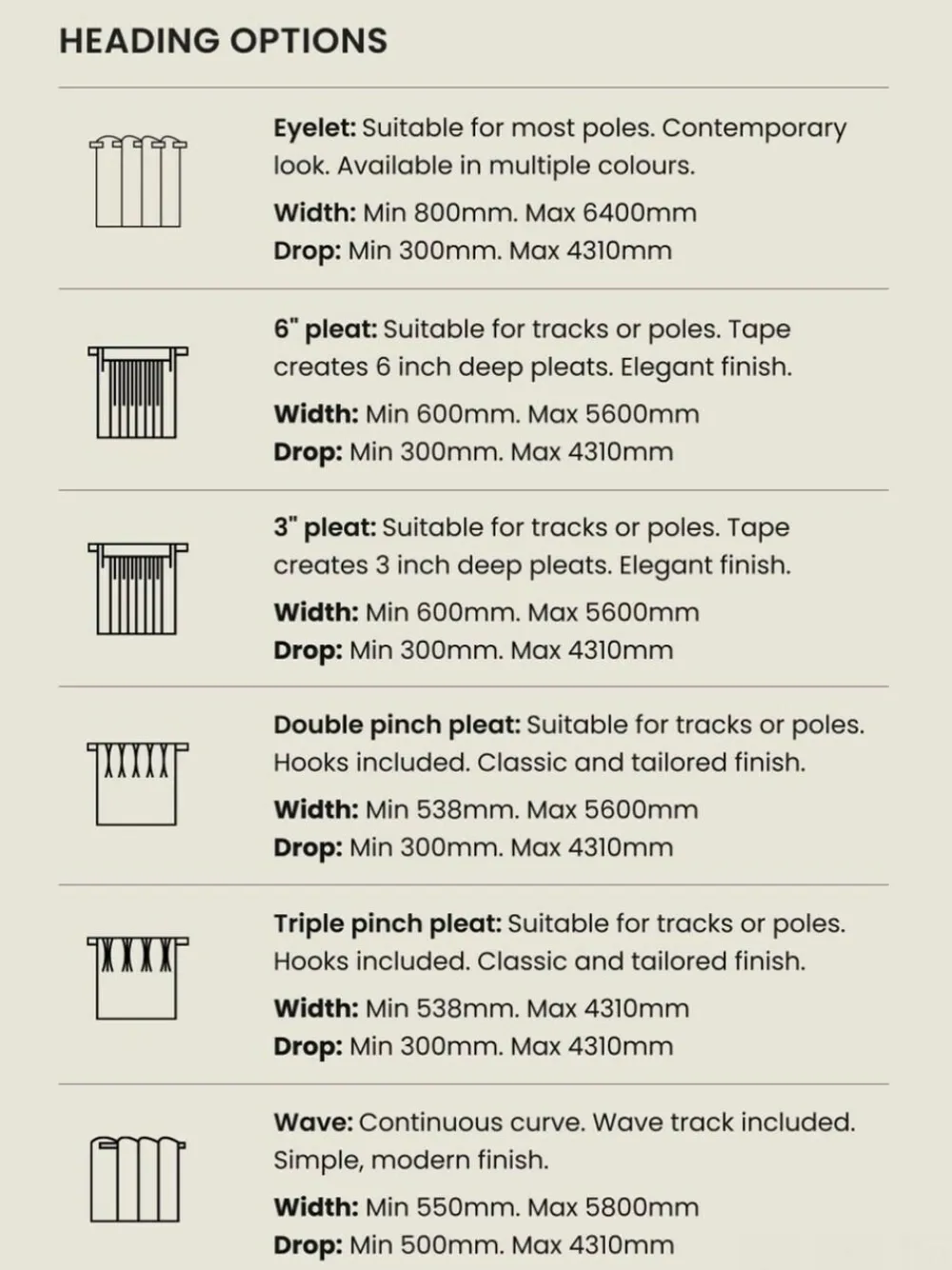 Extra Extra Wide Width (284cm) – 360 to 480cm. All curtains are lined and sold in pairs.