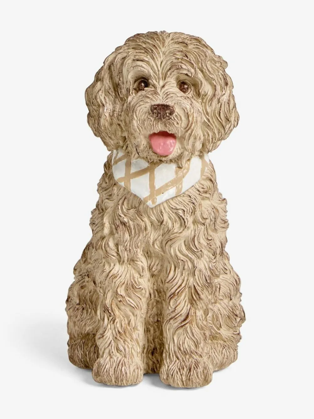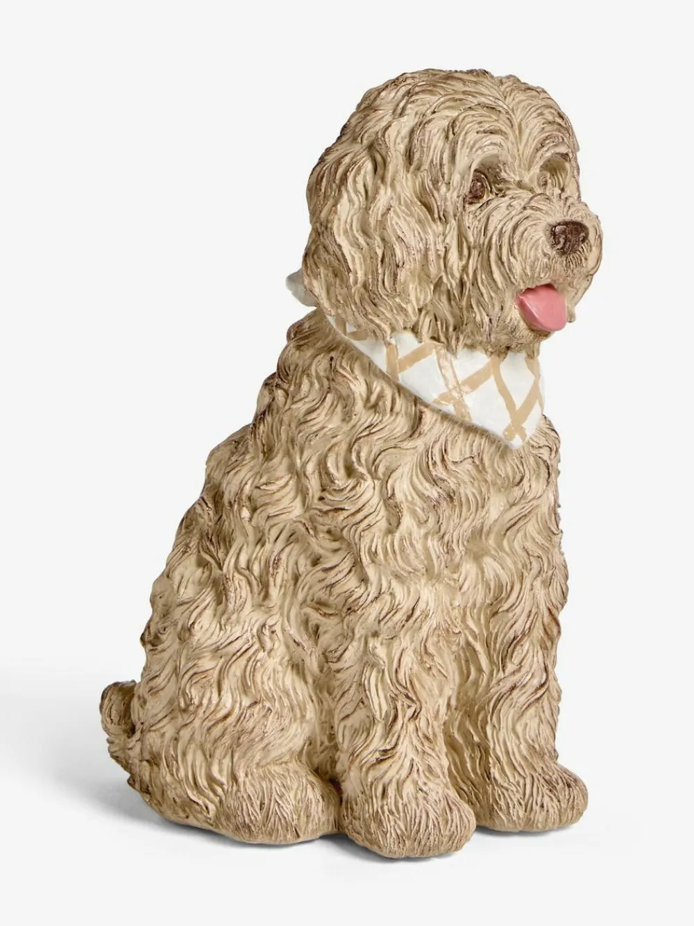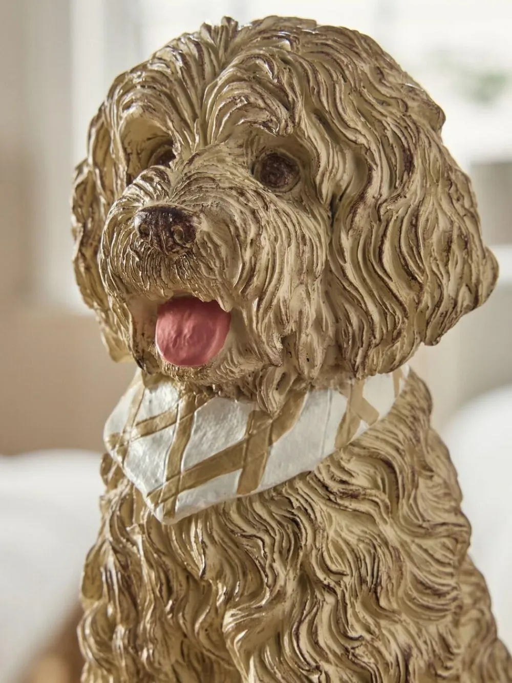 Meet Louis! This irresistibly cute Labradoodle ornament will bring a smile to your face every day. With his wonderfully wavy fur, sweet expression, and stylish bandana, Louis is the perfect addition to any dog lover’s home. Place him on a shelf, desk, or mantelpiece for a touch of heartwarming charm. Height 15.5cm Width 8cm Depth 11cm 100% Resin.