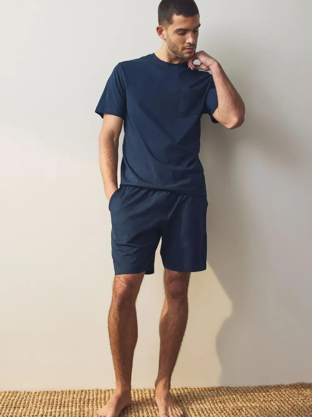 This 2-pack of navy blue and grey pyjamas is perfect for staying well stocked when it comes to sleepwear, featuring cotton-blend short sleeve t-shirts with crewneck collars, alongside matching shorts with an elasticated waistband and side pockets. 2-pack Cotton-blend fabric Short sleeve t-shirts Crewneck collar Elasticated waist shorts Side pockets Pyjama Top and Pyjama Bottom 100% Cotton. Pyjama Bottom and Pyjama Top 95% Cotton, 5% Viscose. Warning: Keep away from fire and flames.