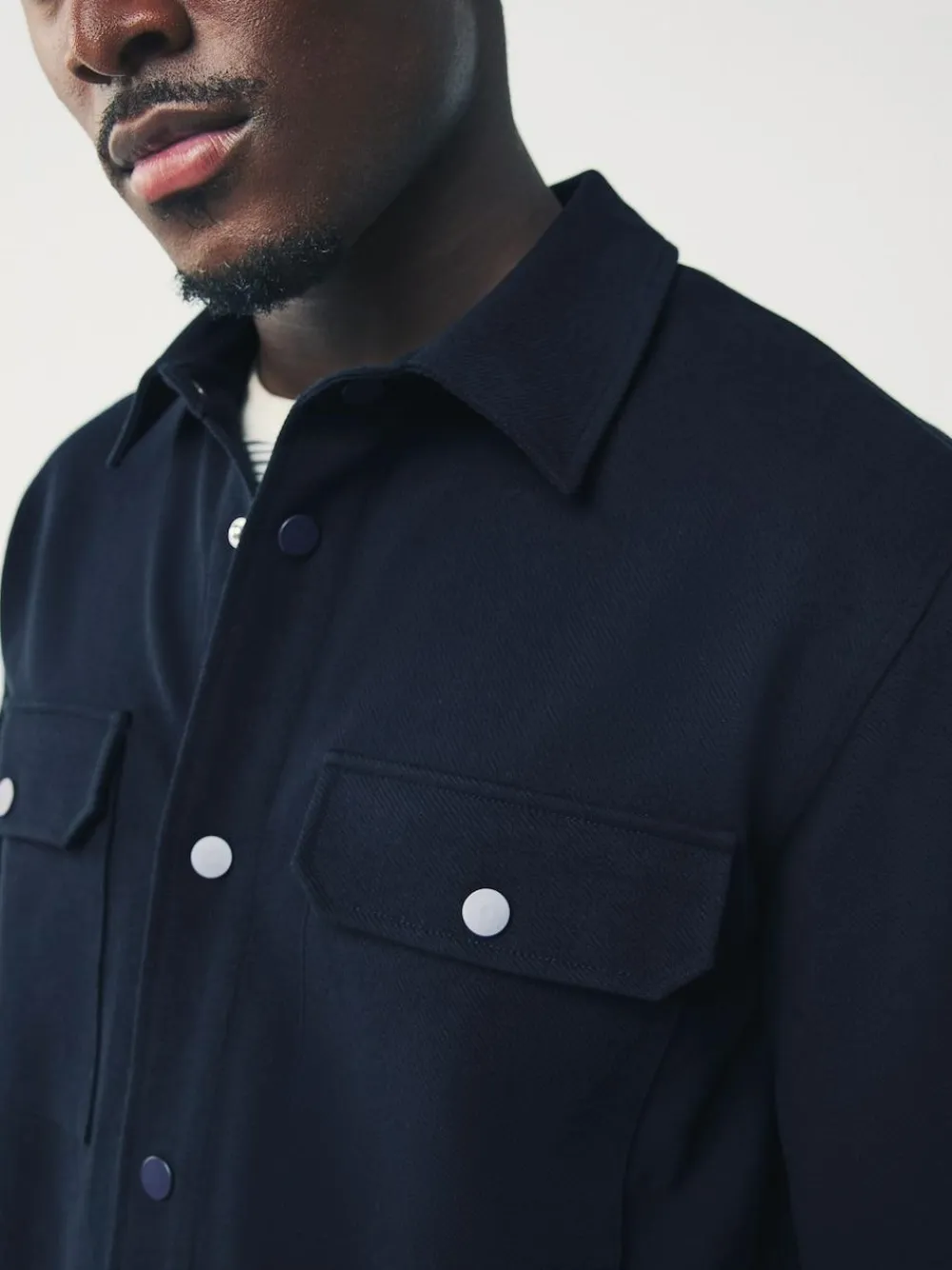A comfortable casual shacket is your new weekend fix, blending the structure of a shirt with the weight of a jacket. This navy blue piece is made from soft jersey twill and features a neat collar and practical popper fastenings. The regular fit is perfect for easy, stylish layering over t-shirts or jumpers. Jersey twill fabric Shacket style Popper fastenings Regular fit Classic collar Two chest pockets Comfortable weekend wear Machine washable. 54% Cotton, 43% Recycled polyester, 3% Elastane.